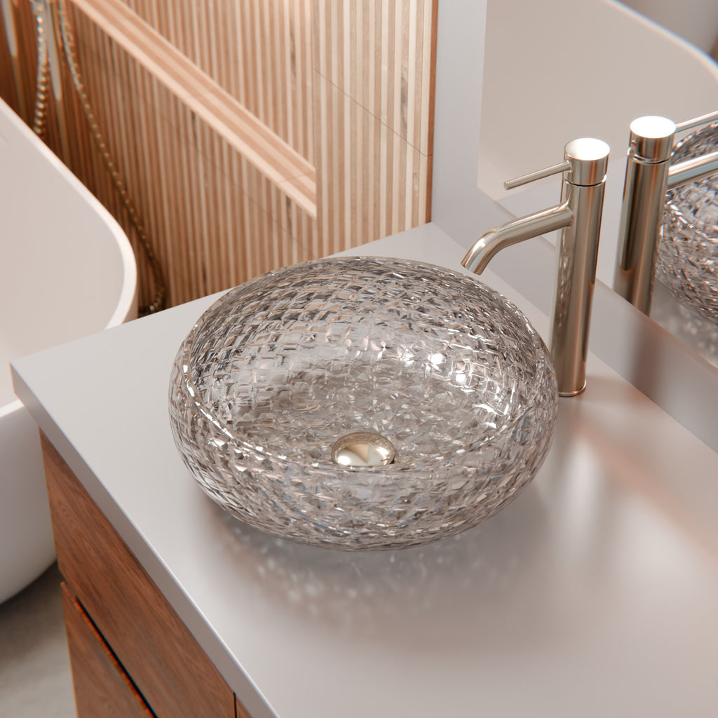 Introducing the DIAMANTE crystal glass vessel bathroom sink, a luxurious addition to any bath or powder room. Combine quality and design with a unique glass vessel and you have a stunning clear crystal sink. Constructed of extra thick clear glass crystal, this glassware is modern and stylish in design and very suitable for most bathrooms, adding an artistic flavor. Perfect for those seeking the ideal mix of luxury and practicality