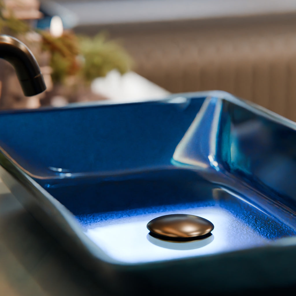 Strikingly alluring, this foiled blue vessel sink is a fixture of beauty. From the exclusive hand-foiled glass vessel collection of Novatto, the ECCITARE will stir the imagination and excitement to any bath. This glass vessel sink will enhance and harmonize the look of any bath by unifying the color and textural design. Constructed of high-tempered glass, Novatto's shallow rectangular sink has a distinct bold blue design with exciting undertones of teal. At 21.75 inches wide, there's plenty of room to wash up.