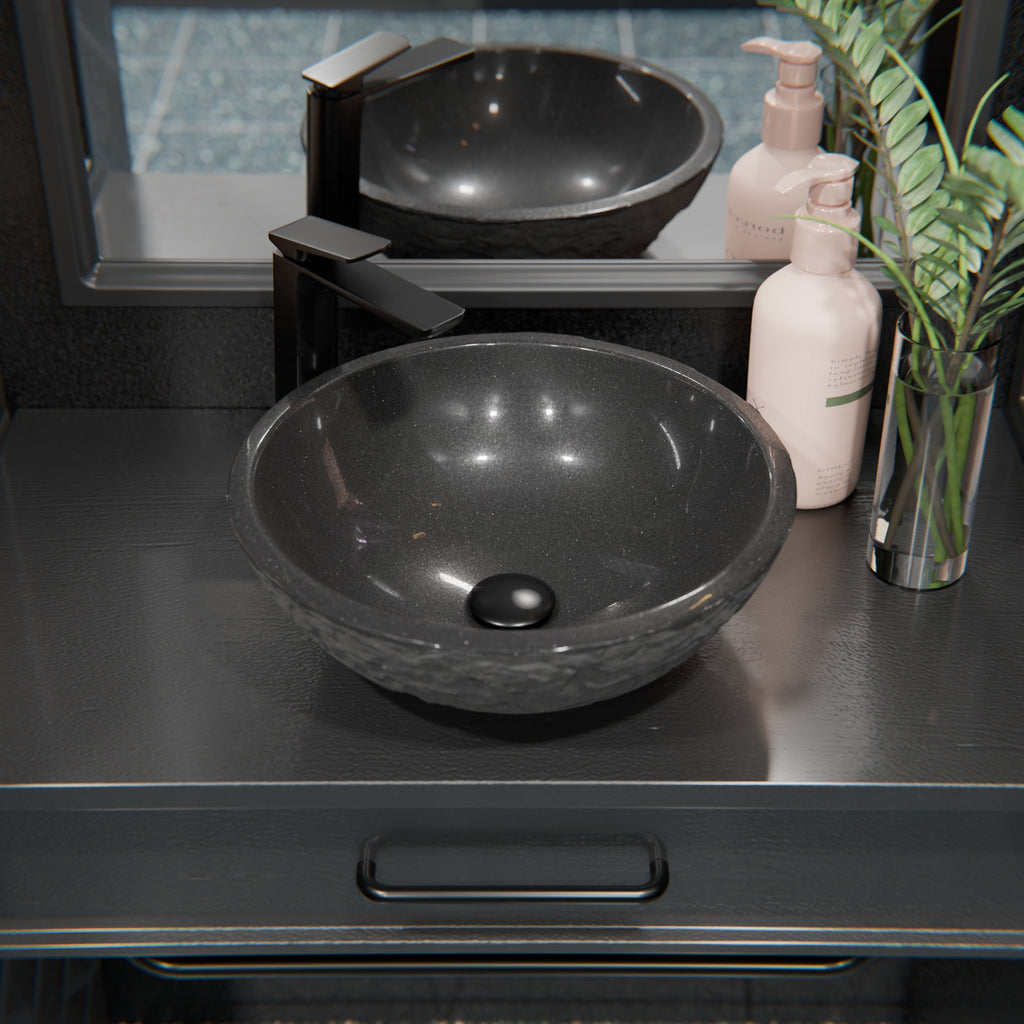 Inspired by the characteristics of Mother Nature, Novatto's absolute black granite vessels will add a touch of charm to your bath. Our absolute granite vessels come from around the world to become your one-of-a-kind bath masterpiece. Natural stone cannot be compared to everyday synthetic porcelain and ceramics. Honed and hand-polished to perfection, this round 17-inch vessel will be the centerpiece of your bath. Black granite is very consistent, and little variation should occur from sink to sink. These sinks are designed for above-counter installation. They have a 1.75-inch drain opening for standard U.S. plumbing connections.