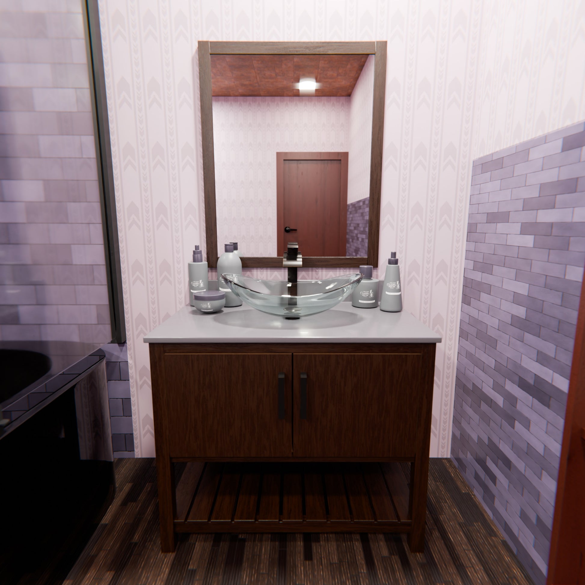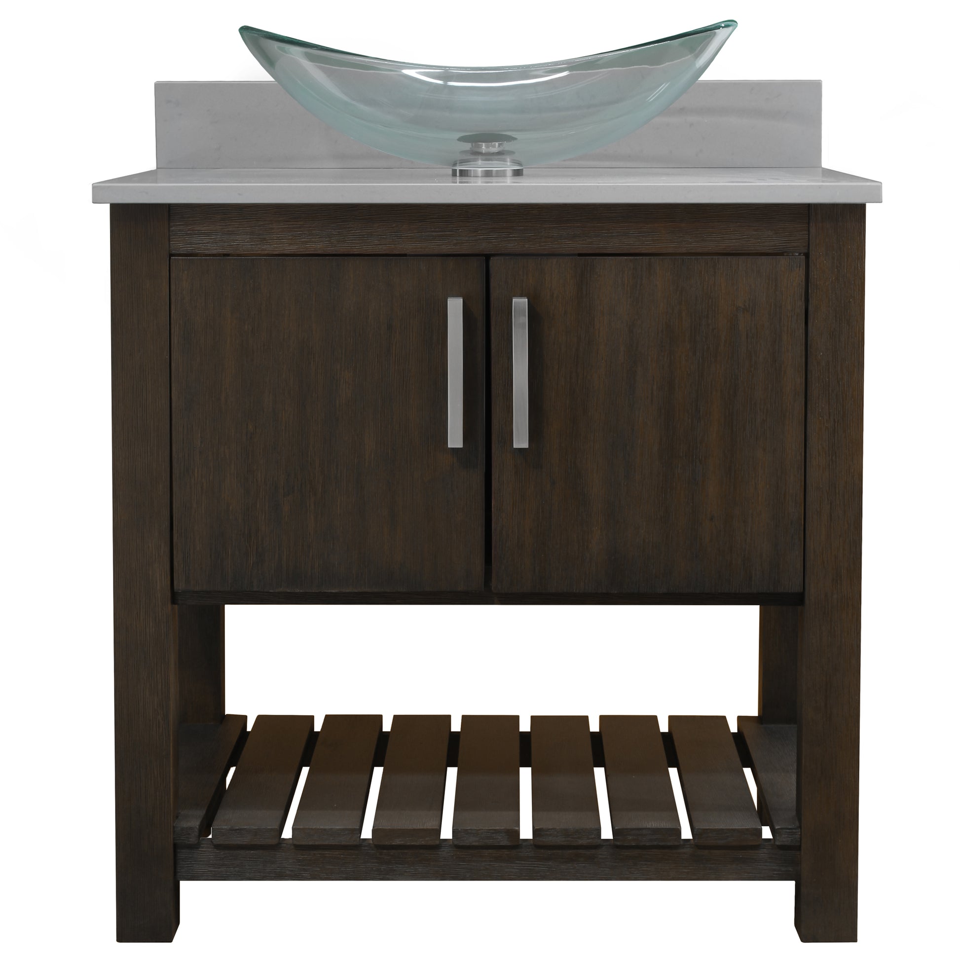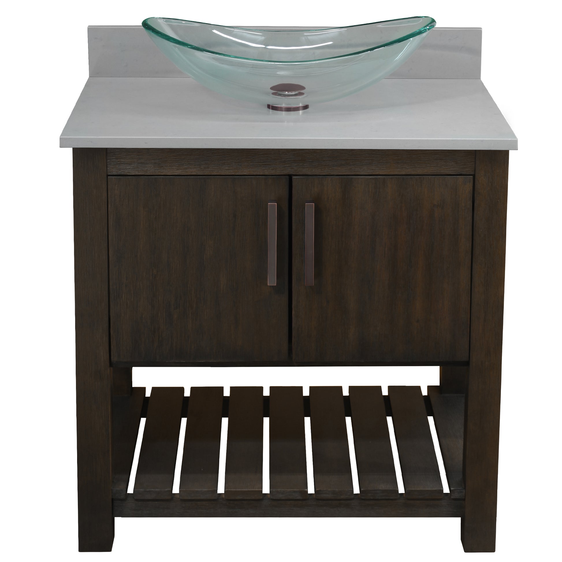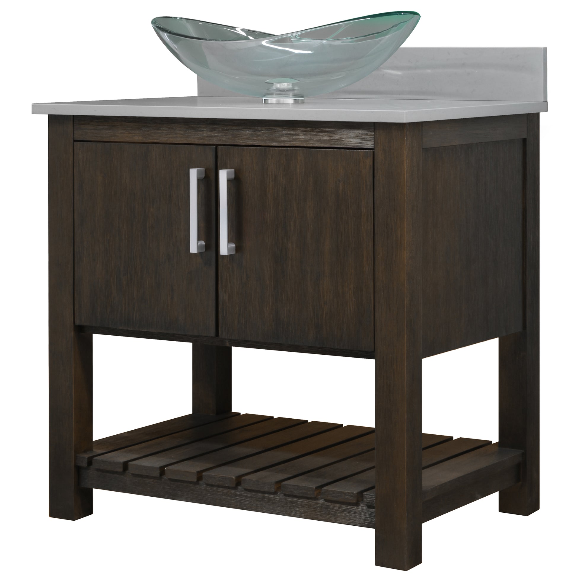 - Set includes: Assembled vanity, quartz top, backsplash, glass vessel sink, pop-up drain with matching mounting ring and p-trap