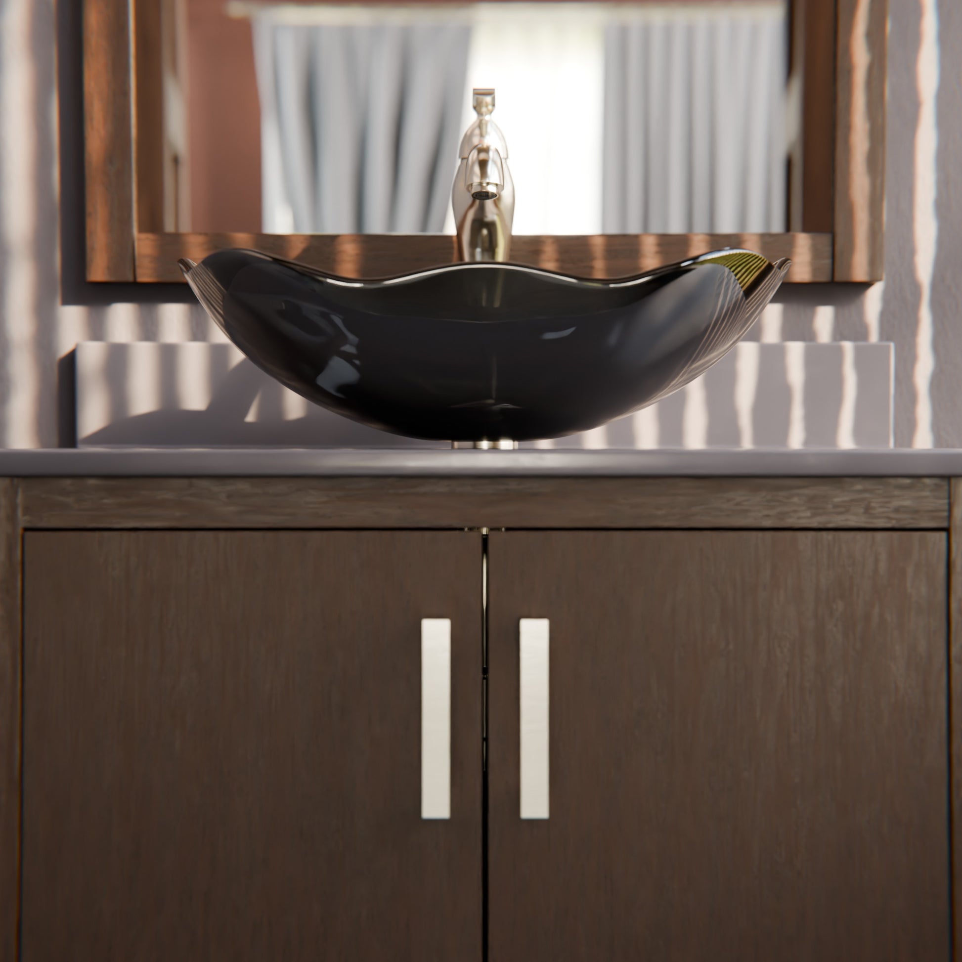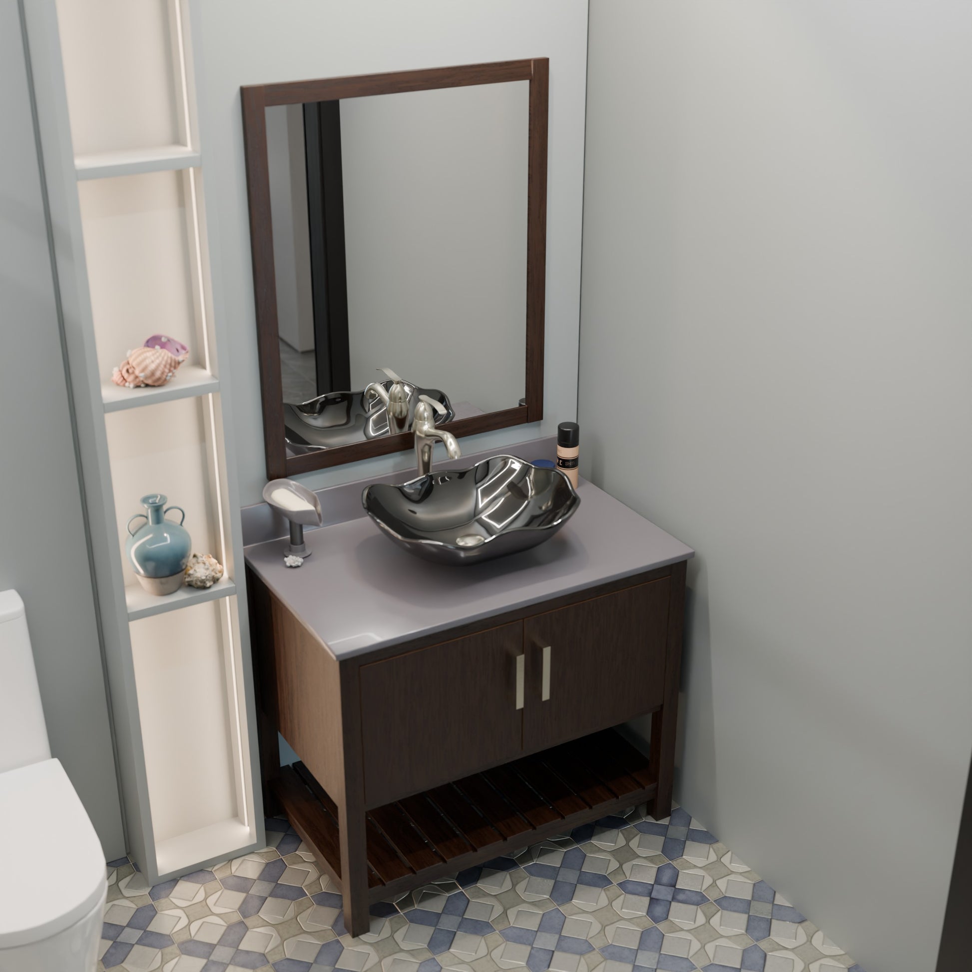 - Vanity's wood finish is a rich Café Mocha color