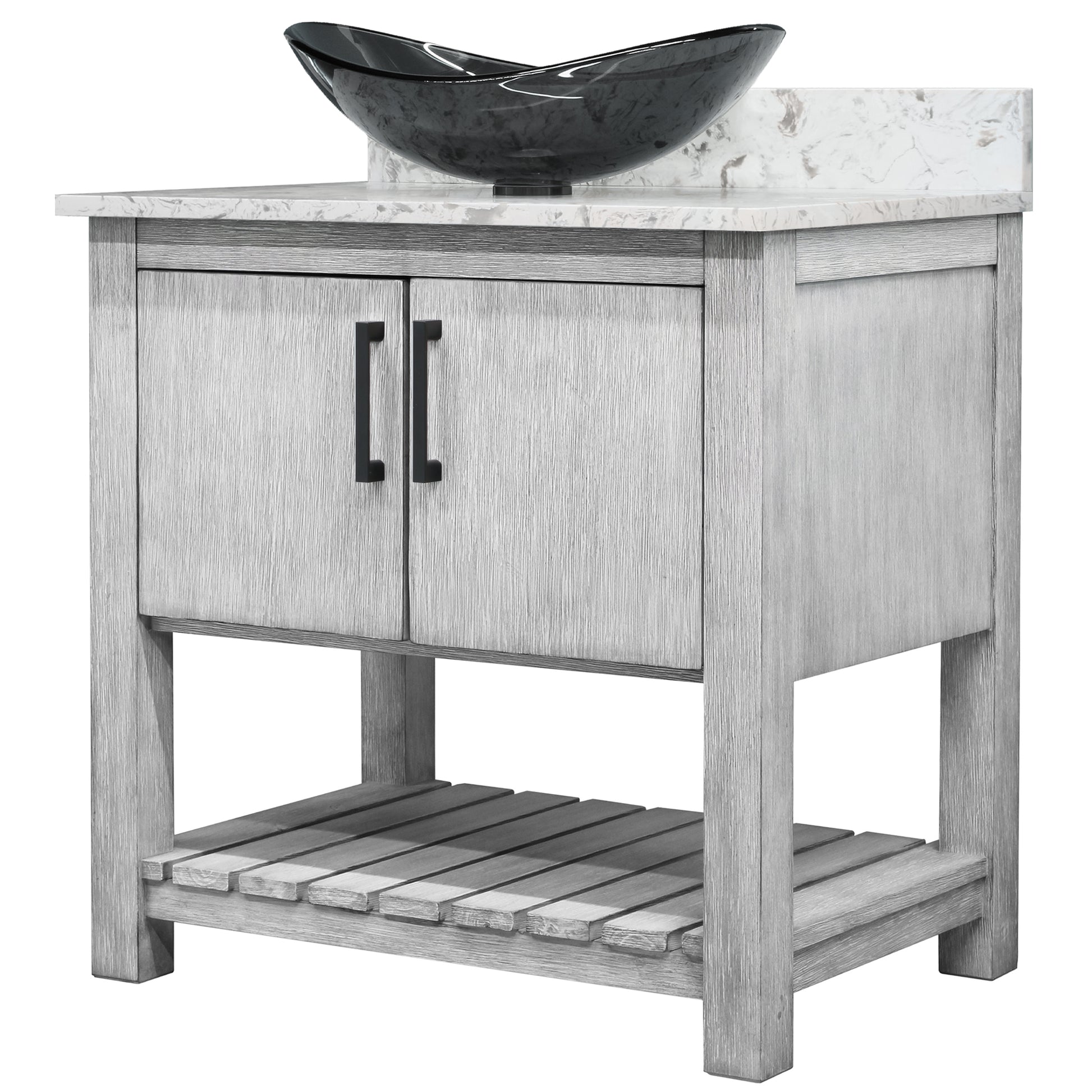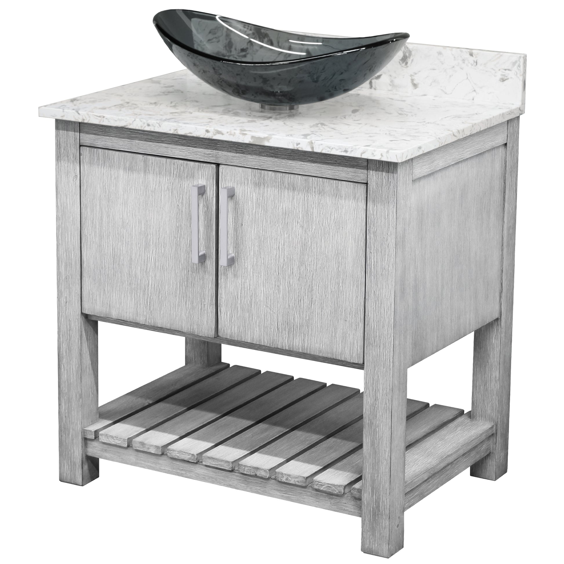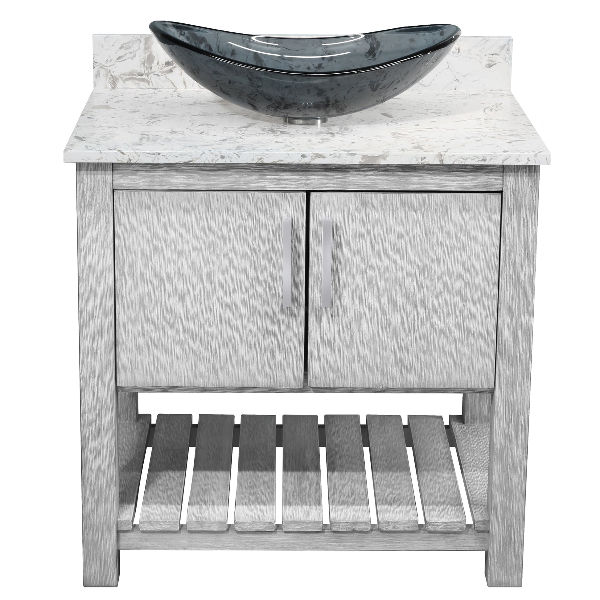- Set includes: assembled vanity, door handles, quartz top, backsplash, glass vessel sink, pop-up drain with matching mounting ring and p-trap