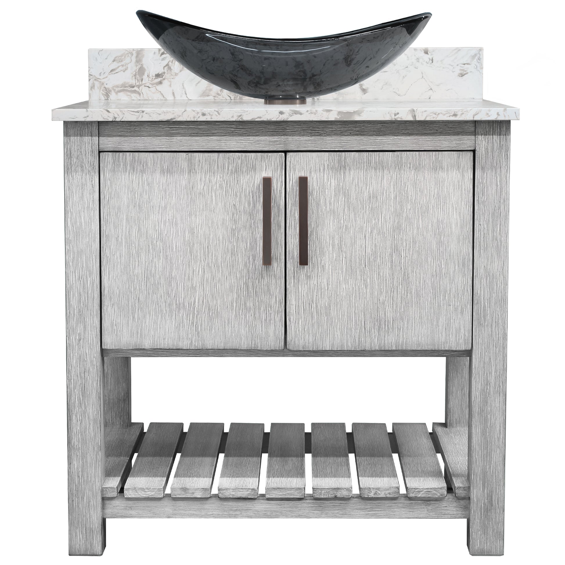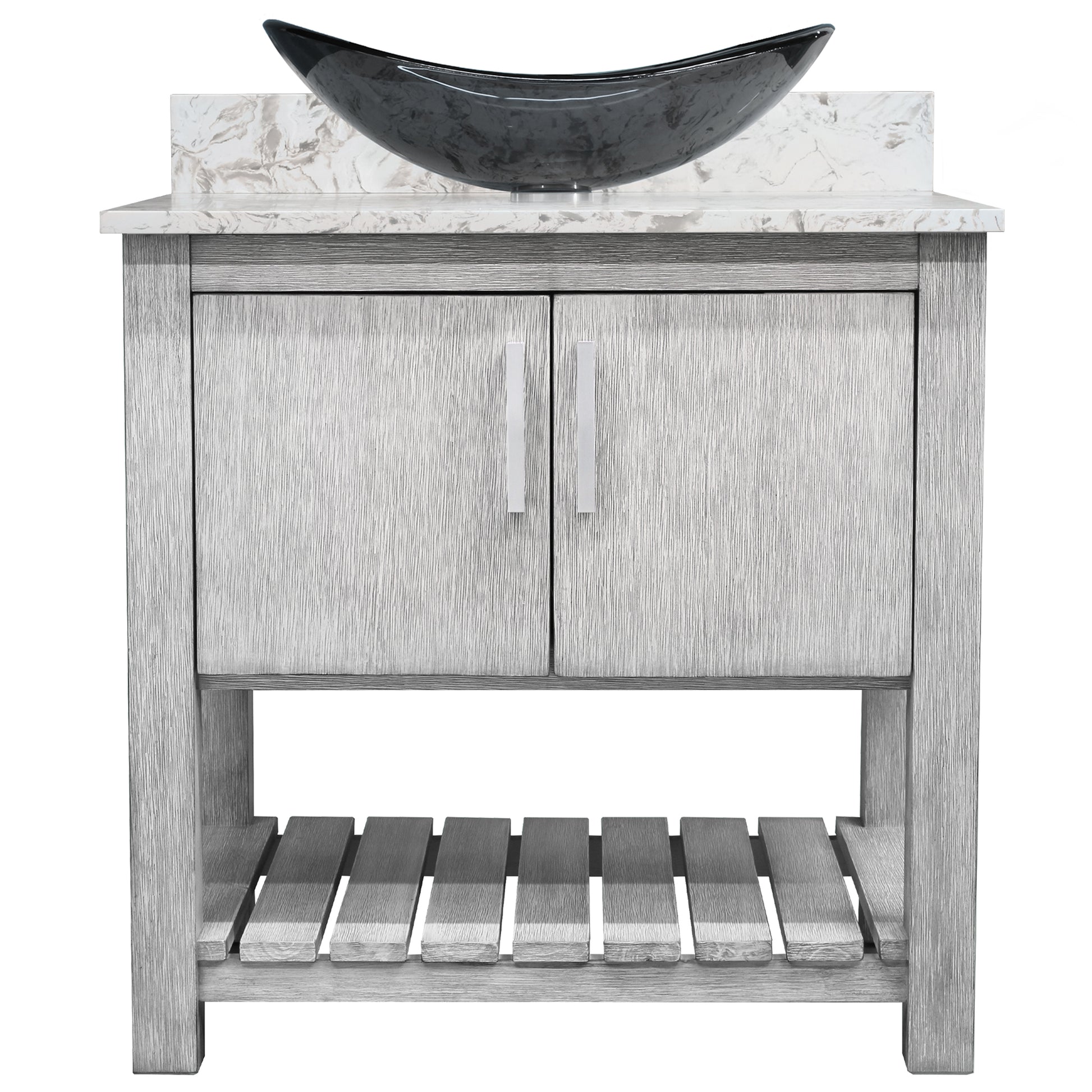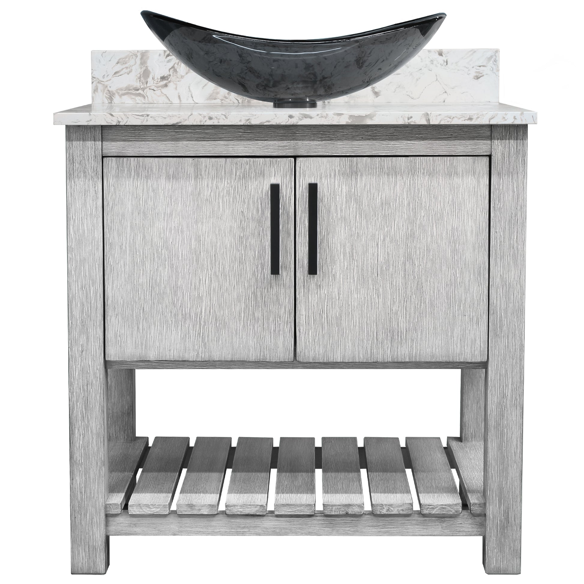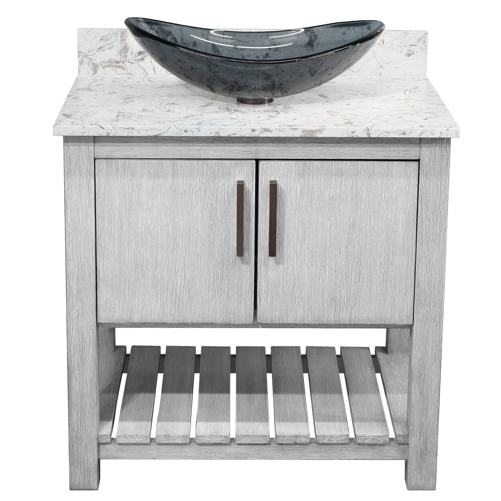 - Set includes: assembled vanity, door handles, quartz top, backsplash, glass vessel sink, pop-up drain with matching mounting ring and p-trap