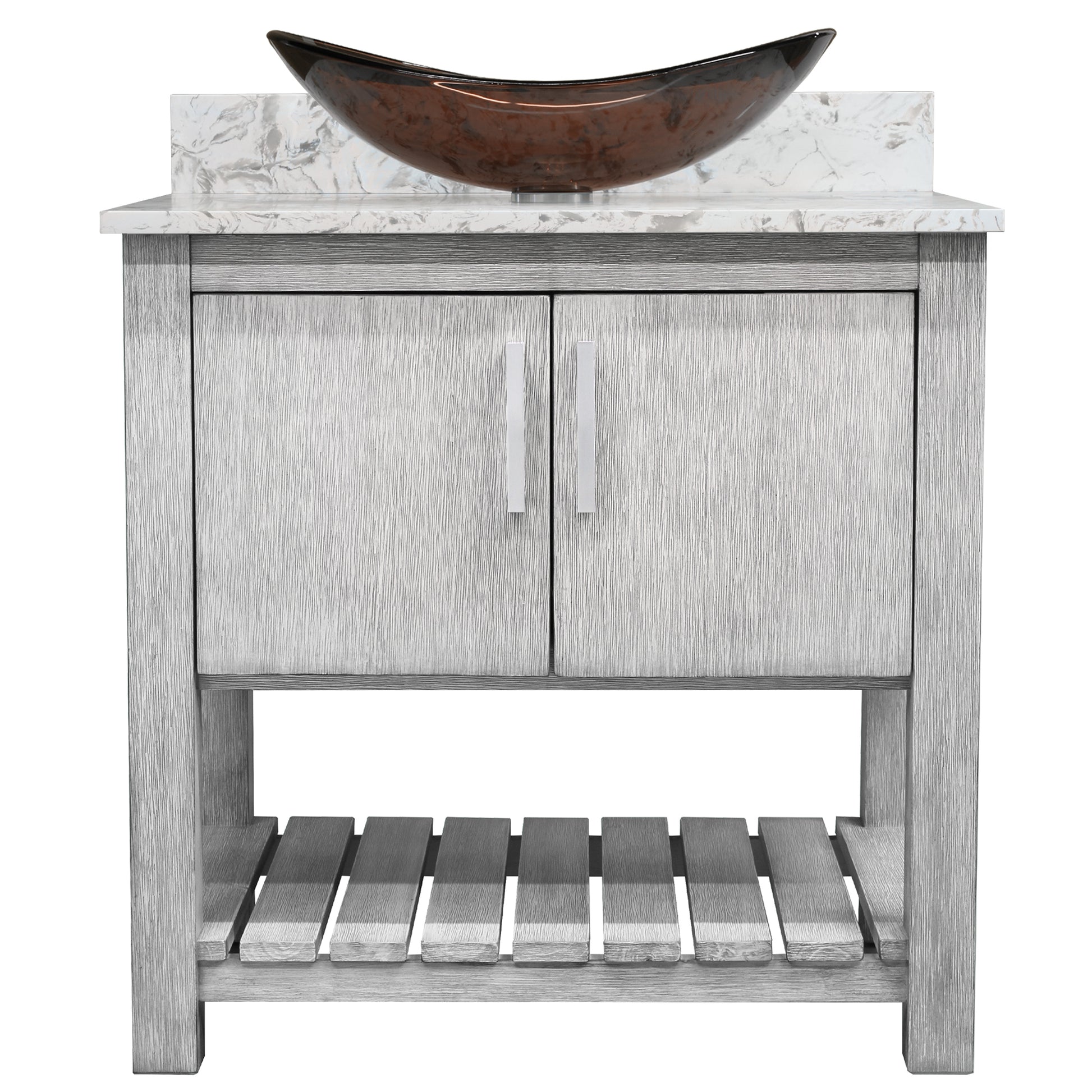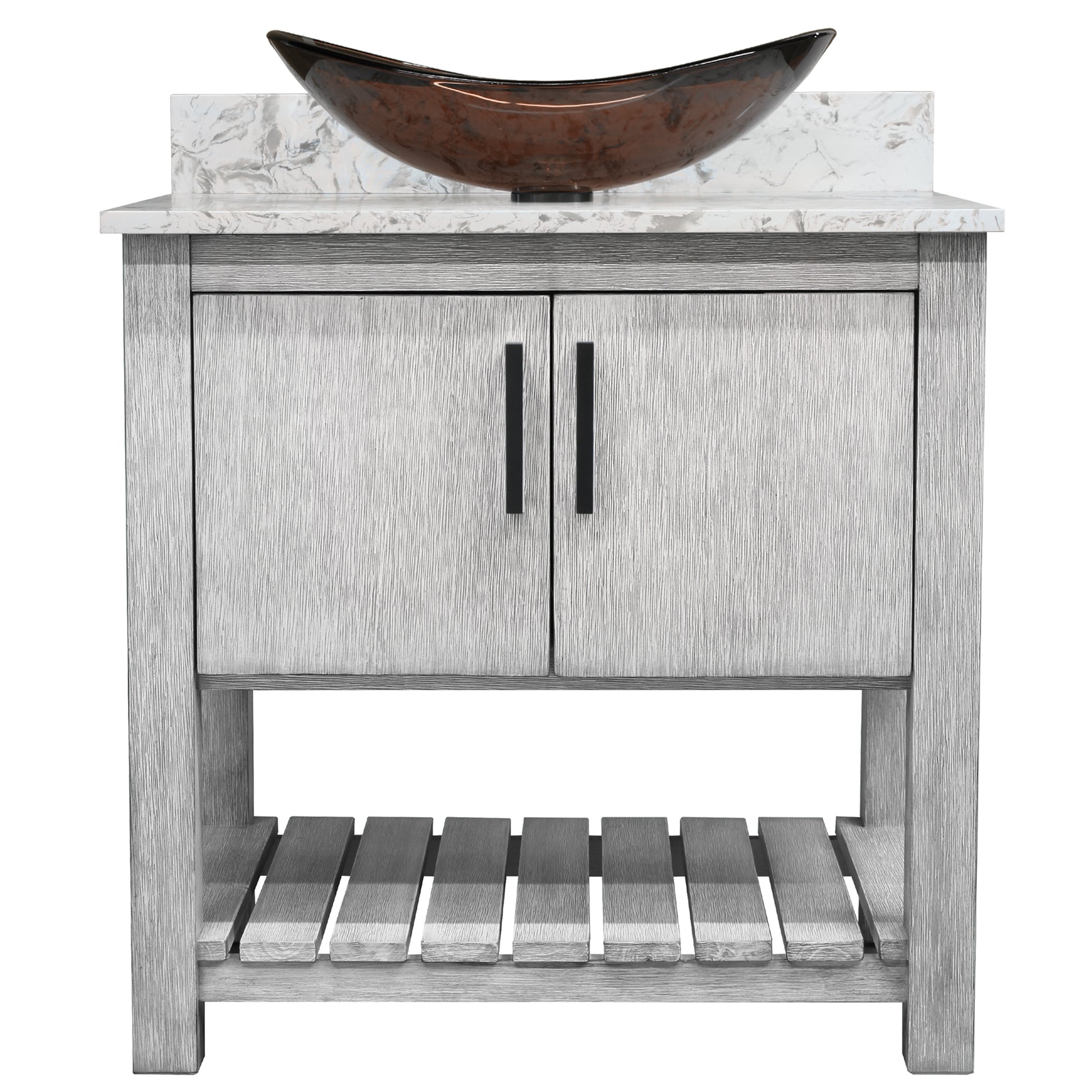 - Set includes: assembled vanity, door handles, quartz top, backsplash, glass vessel sink, pop-up drain with matching mounting ring and p-trap
