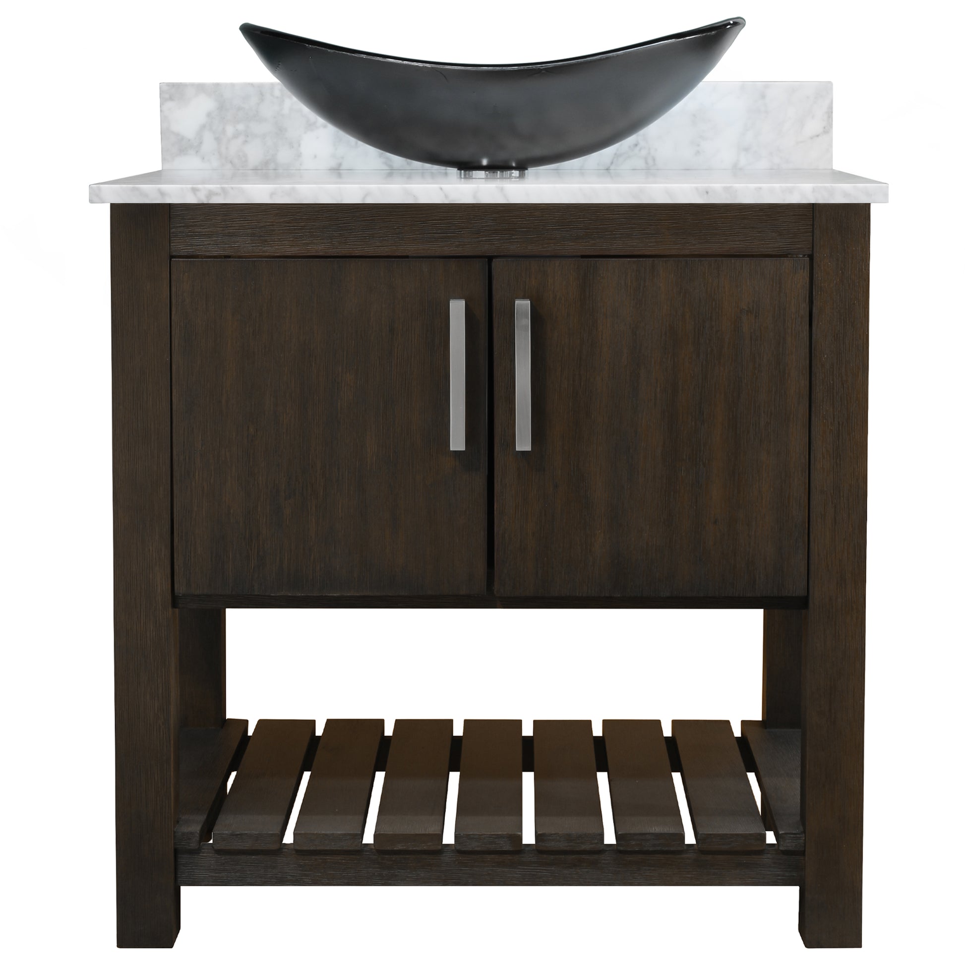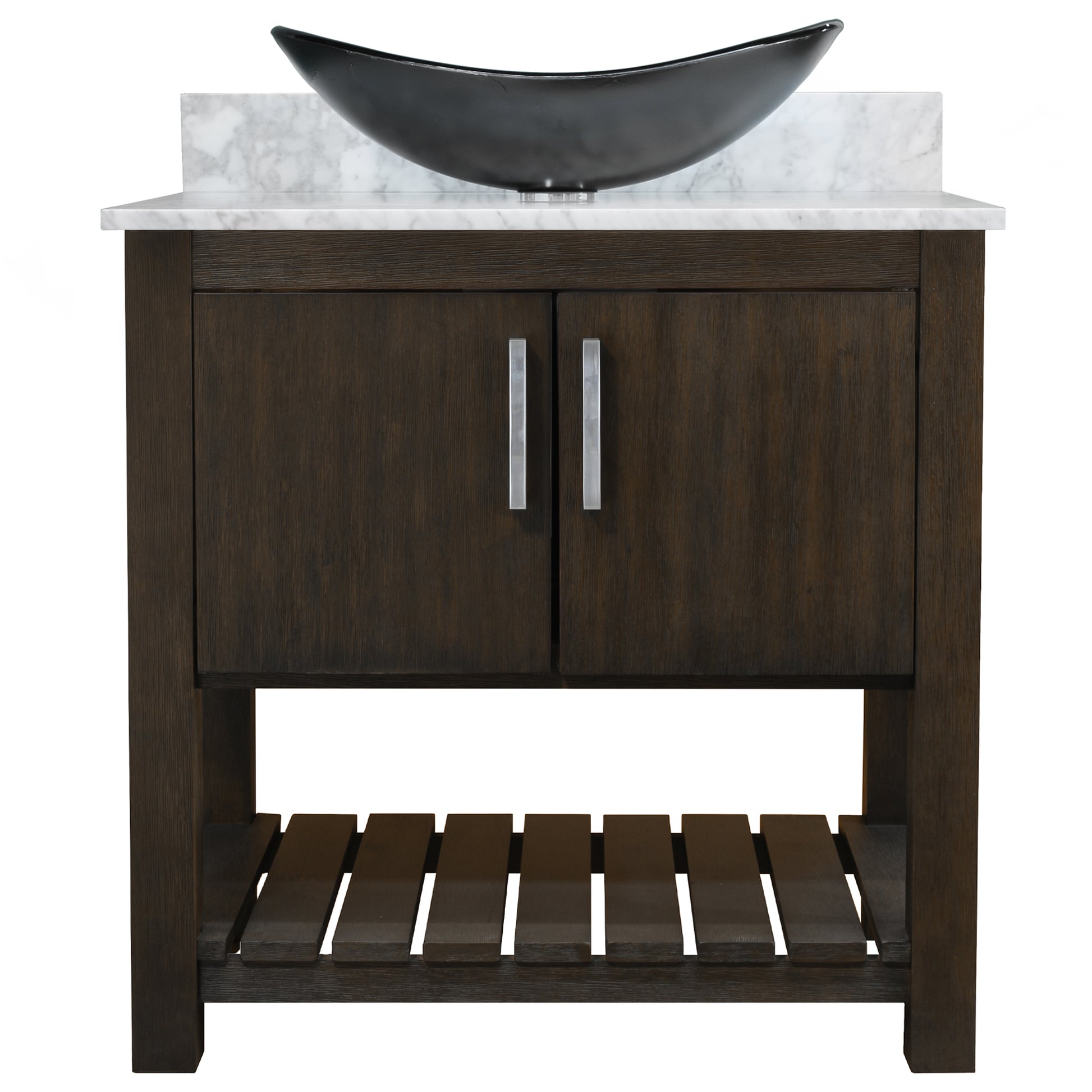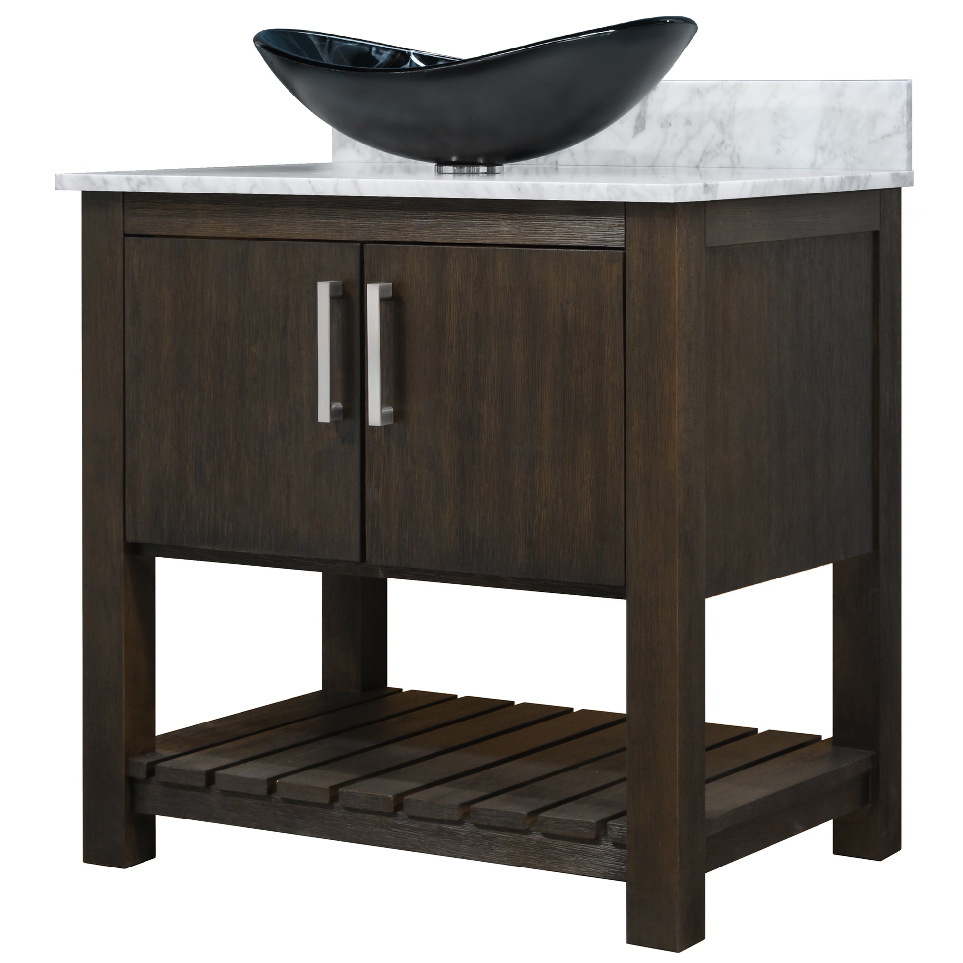 - Set includes: assembled vanity, door handles, marble top & backsplash, glass vessel sink, pop-up drain with matching mounting ring and p-trap