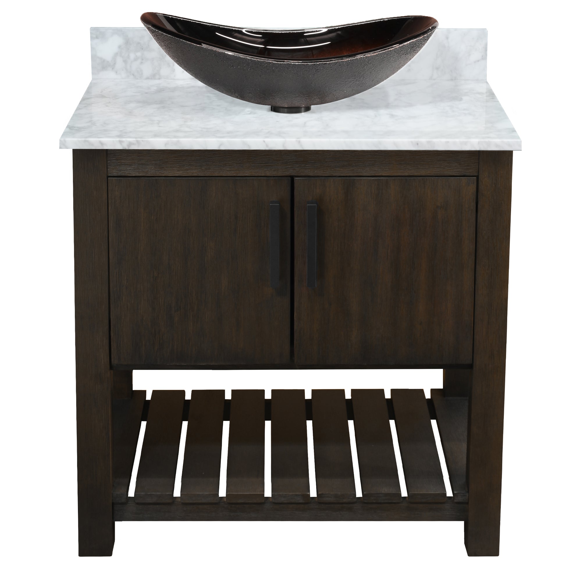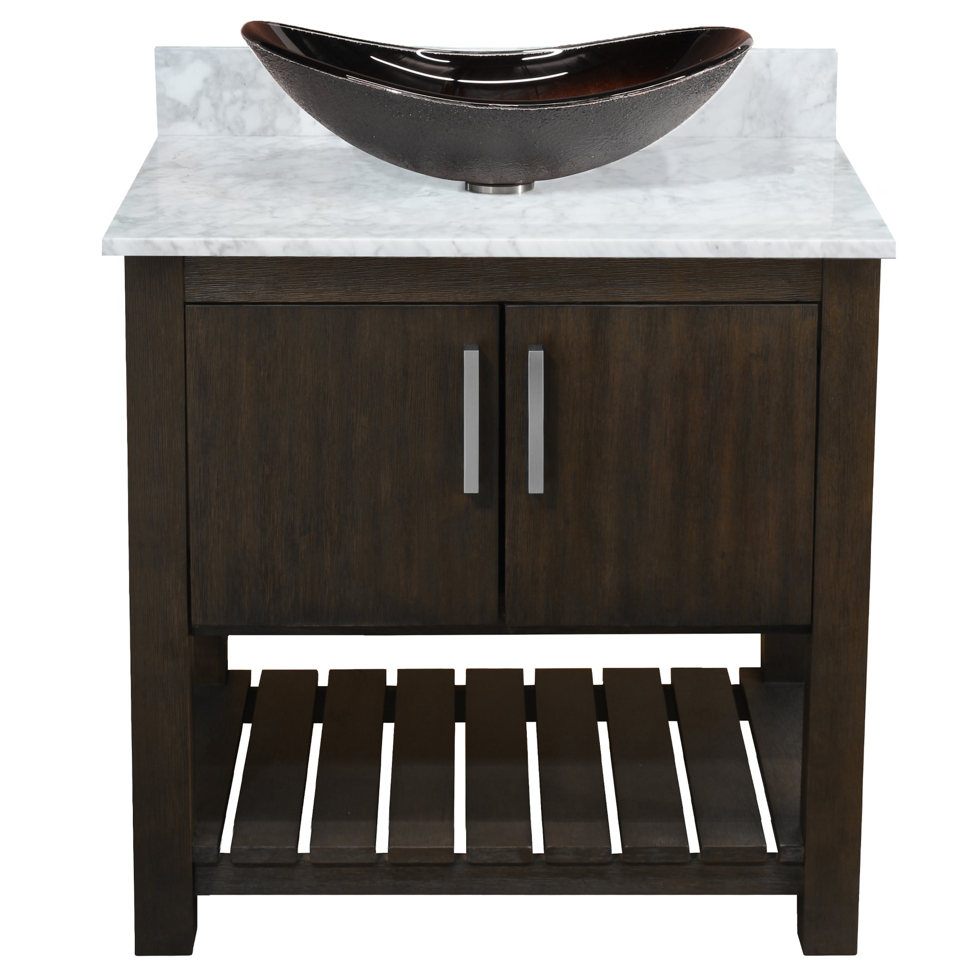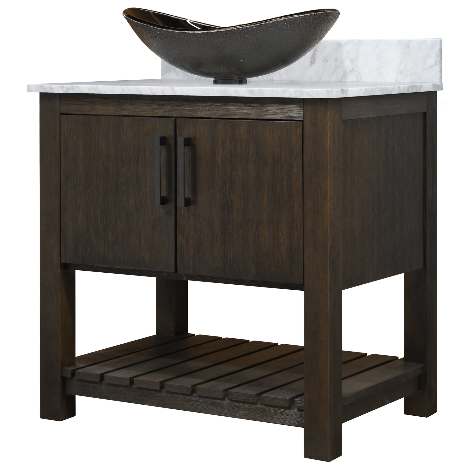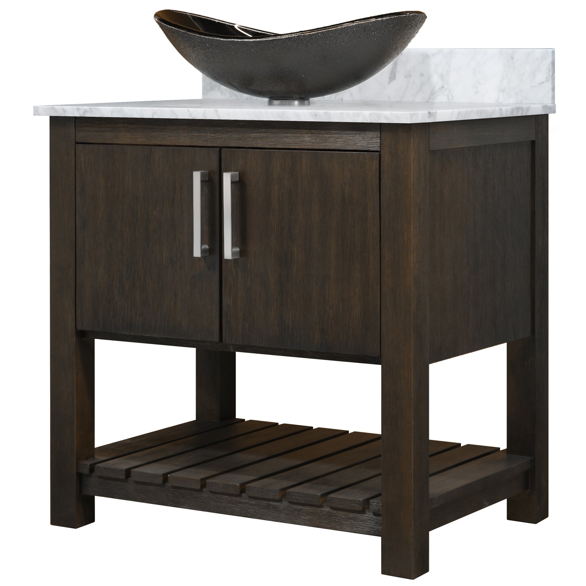 - Set includes: assembled vanity, door handles, marble top, backsplash, glass vessel sink, pop-up drain with matching mounting ring and p-trap