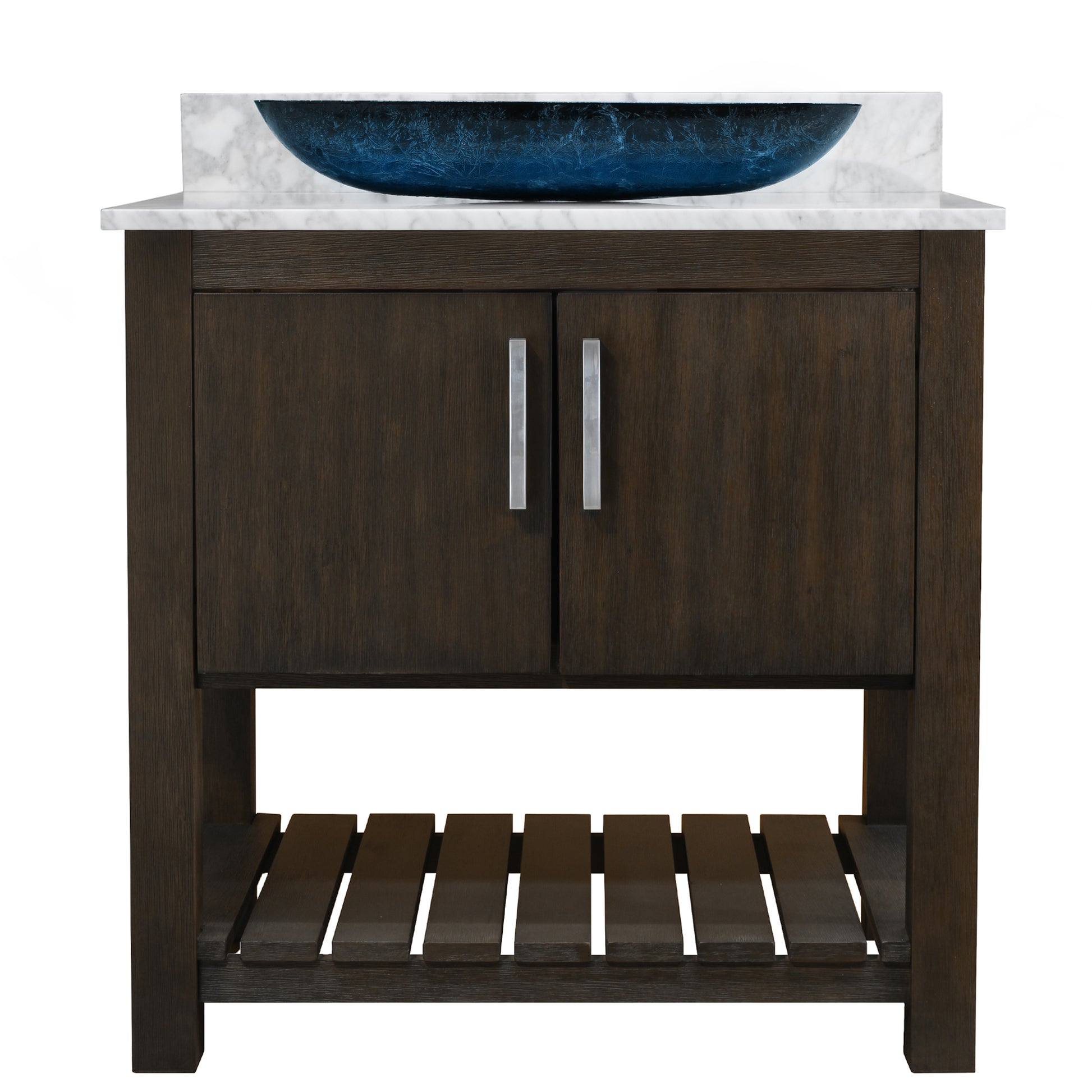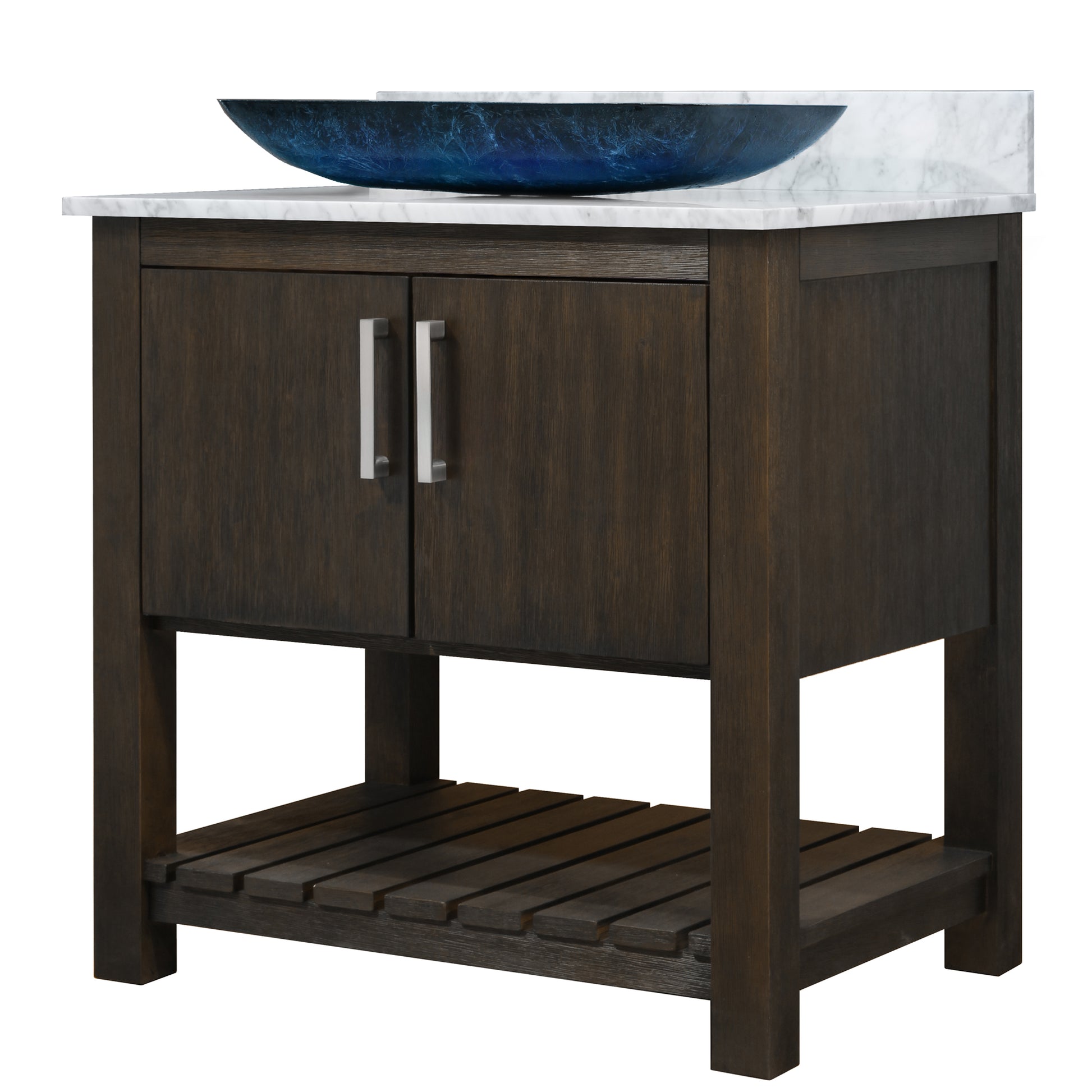 - Set includes: assembled vanity, door handles, marble top & backsplash, glass vessel sink, pop-up drain, and p-trap