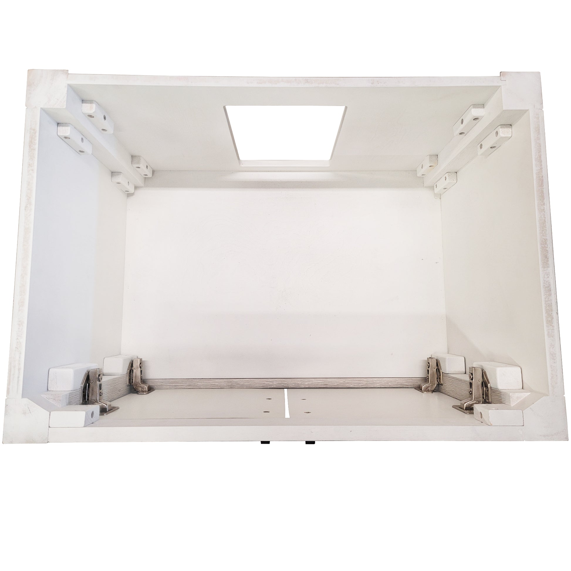 What installation? This vanity is already assembled! There’s plenty of storage behind closed doors along with the wide-open slatted shelf below. The back wall of the vanity is cut out for easy access for plumbing installation.