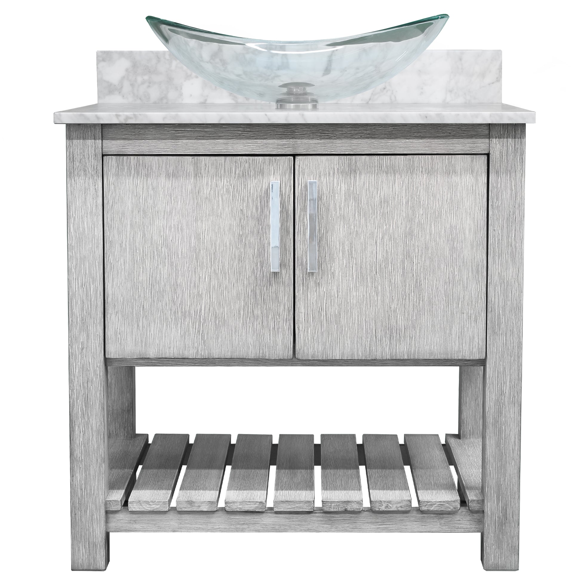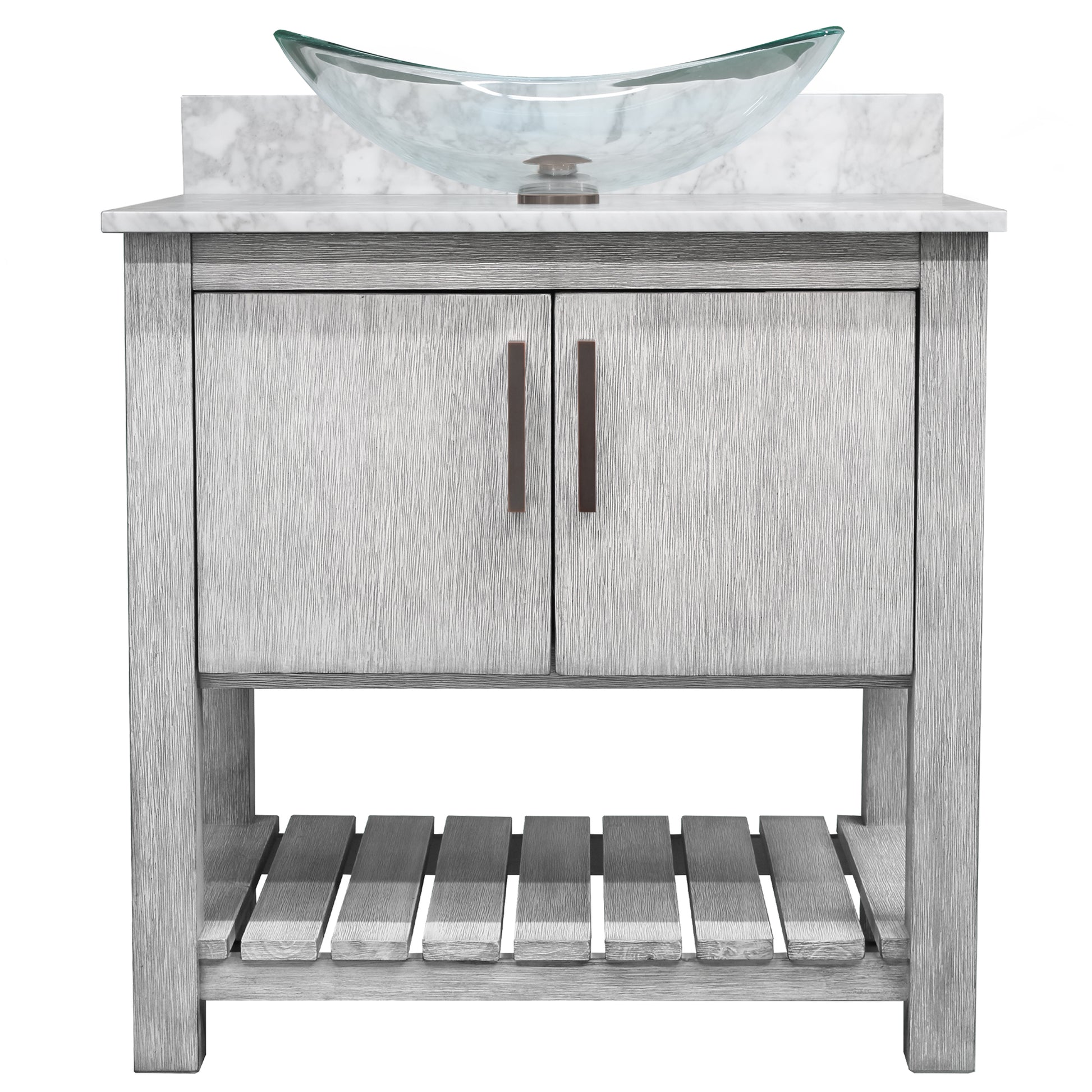 - Set includes: assembled vanity, door handles, quartz top, backsplash, glass vessel sink, pop-up drain with matching mounting ring and p-trap
