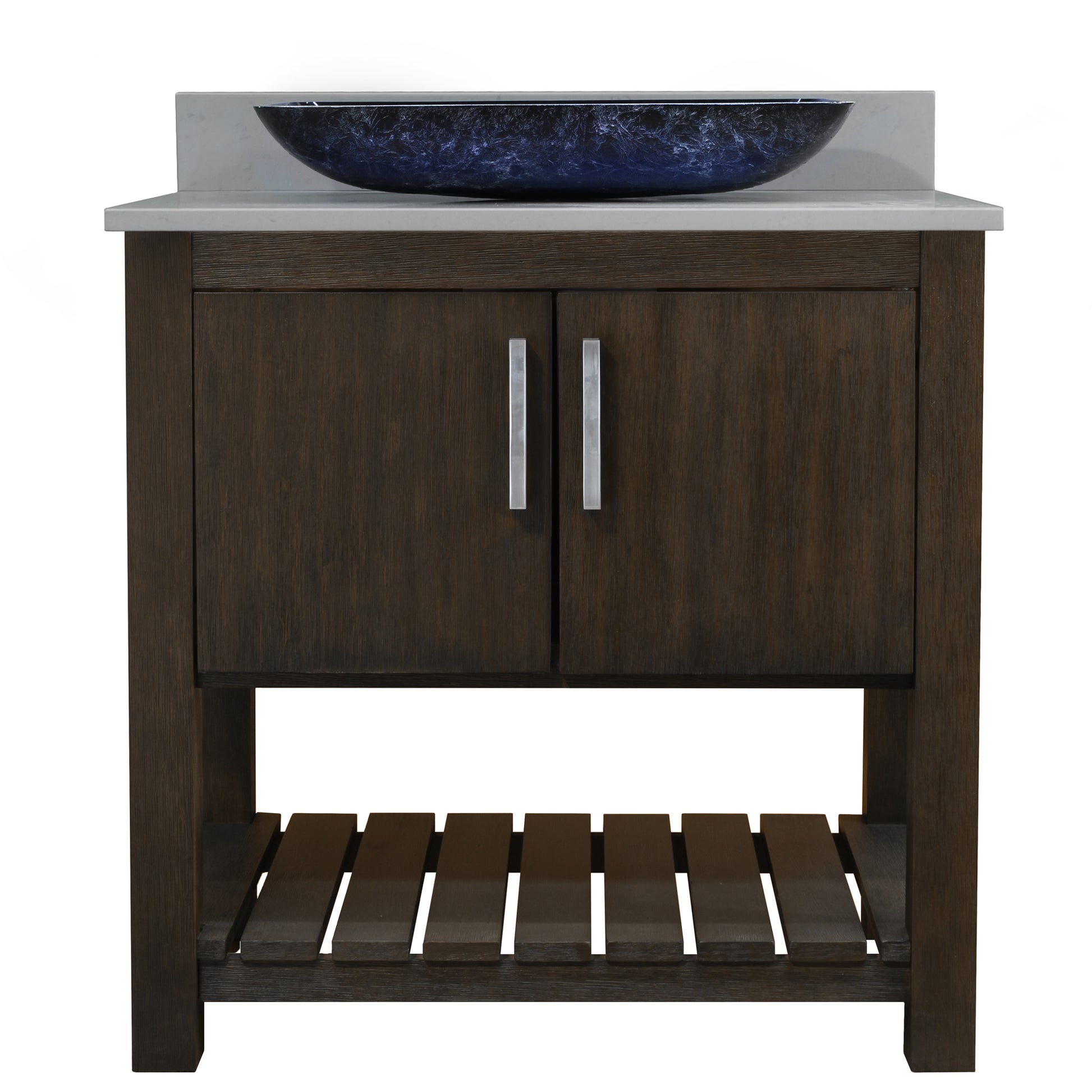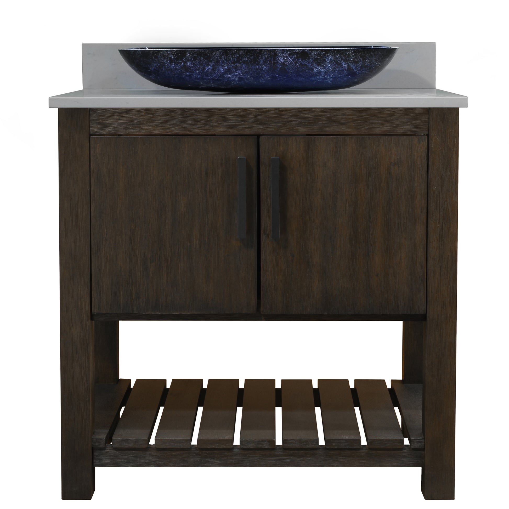 - Set includes: assembled vanity, door handles, quartz top & backsplash, glass vessel sink, pop-up drain, and p-trap
