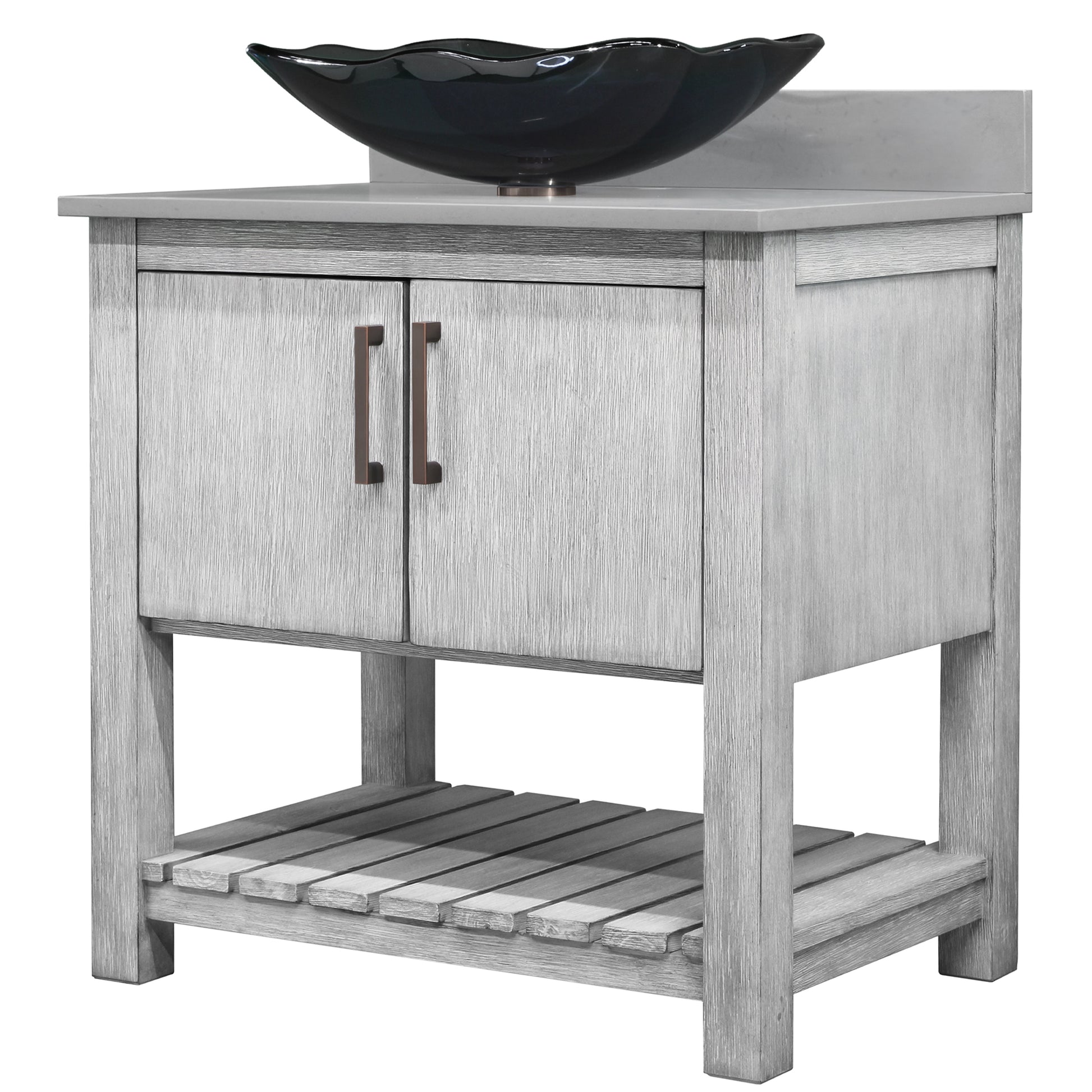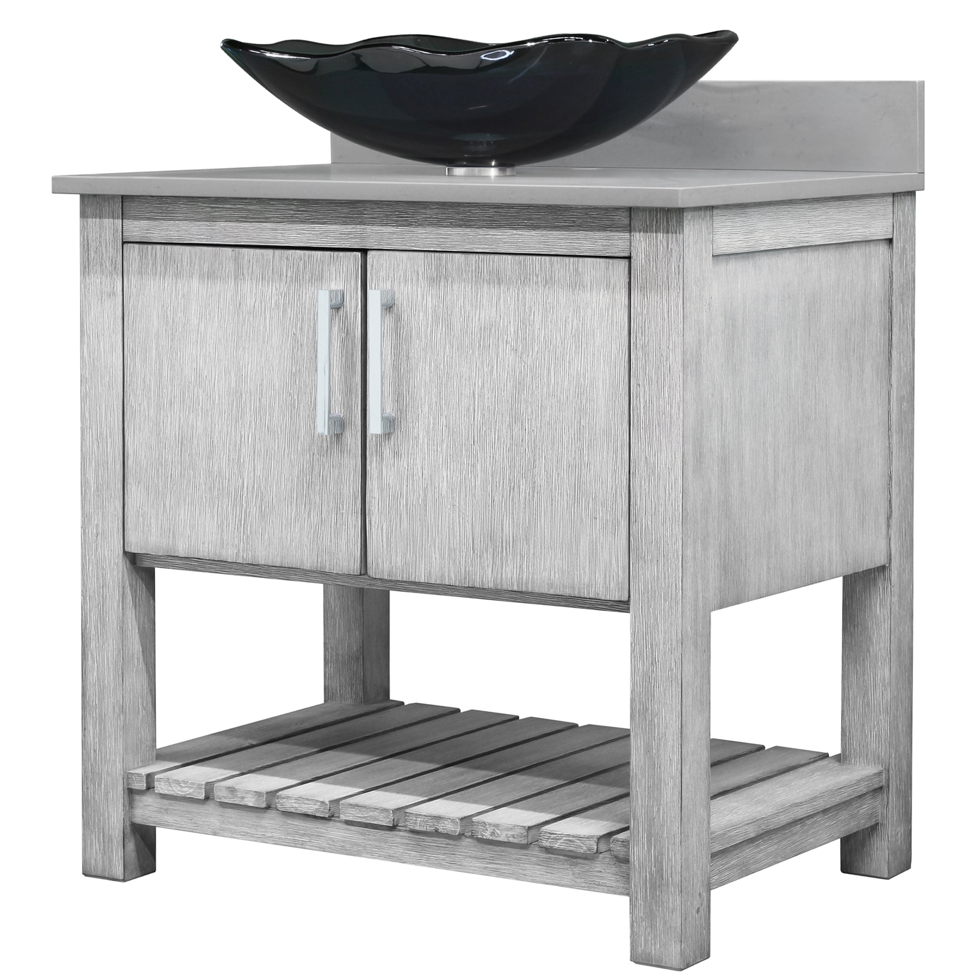 - Set includes: assembled vanity, door handles, quartz top, backsplash, glass vessel sink, pop-up drain with matching mounting ring and p-trap