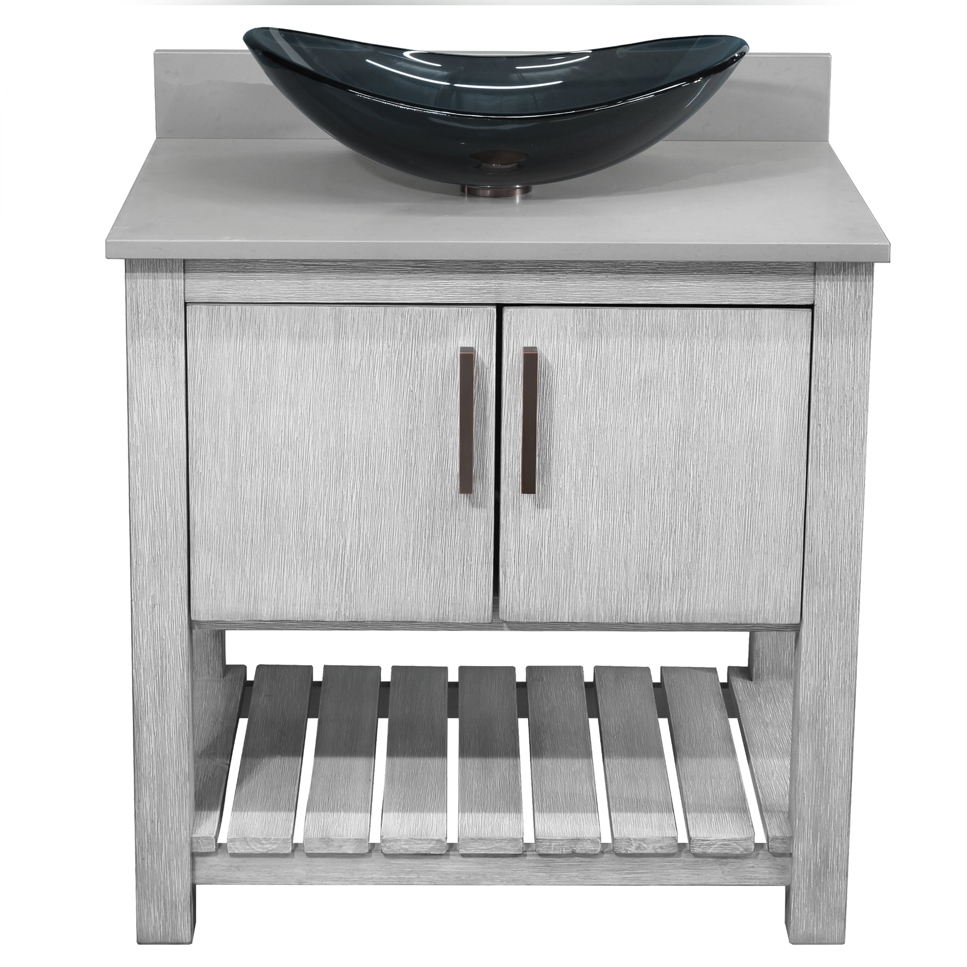 - Set includes: assembled vanity, door handles, quartz top, backsplash, glass vessel sink, pop-up drain with matching mounting ring and p-trap