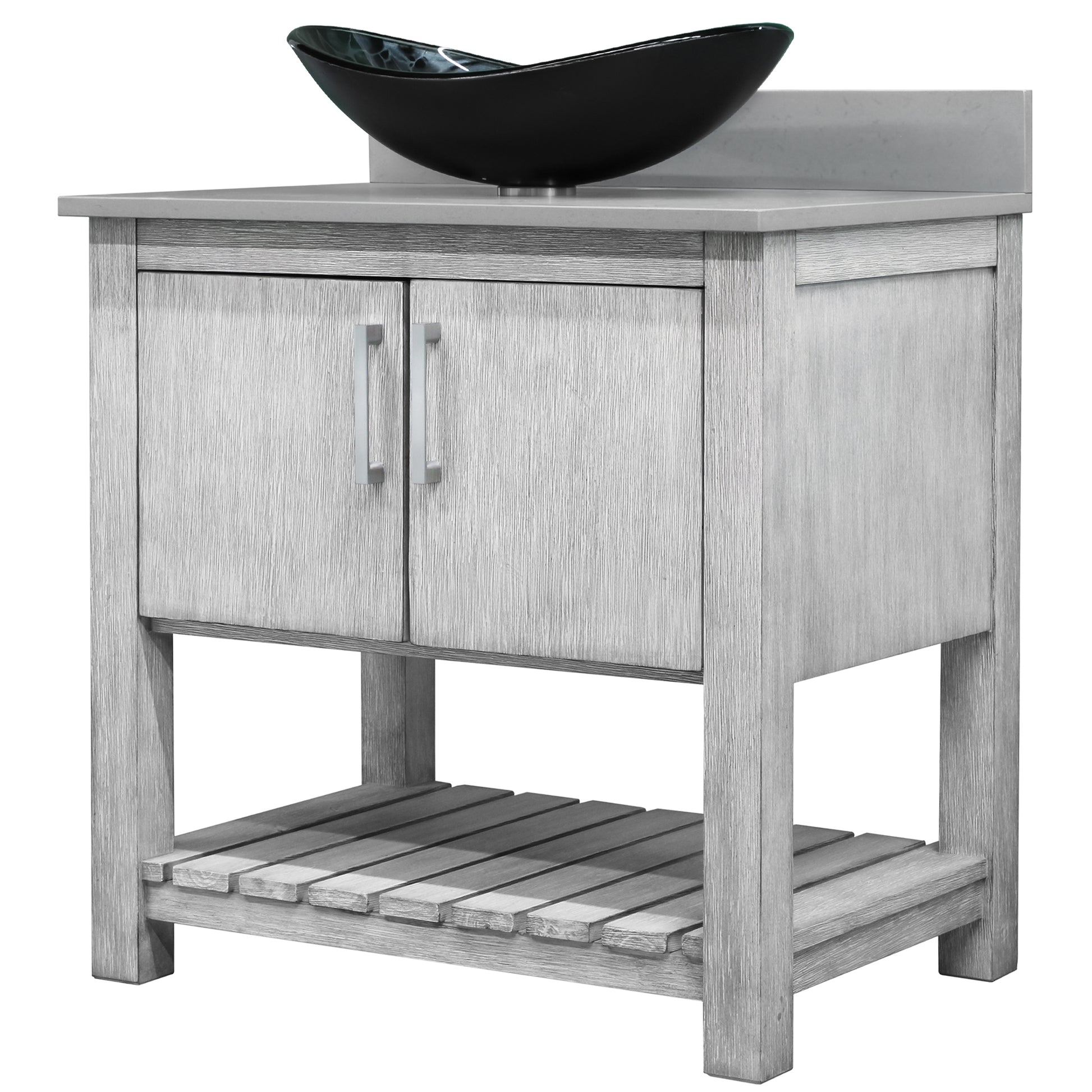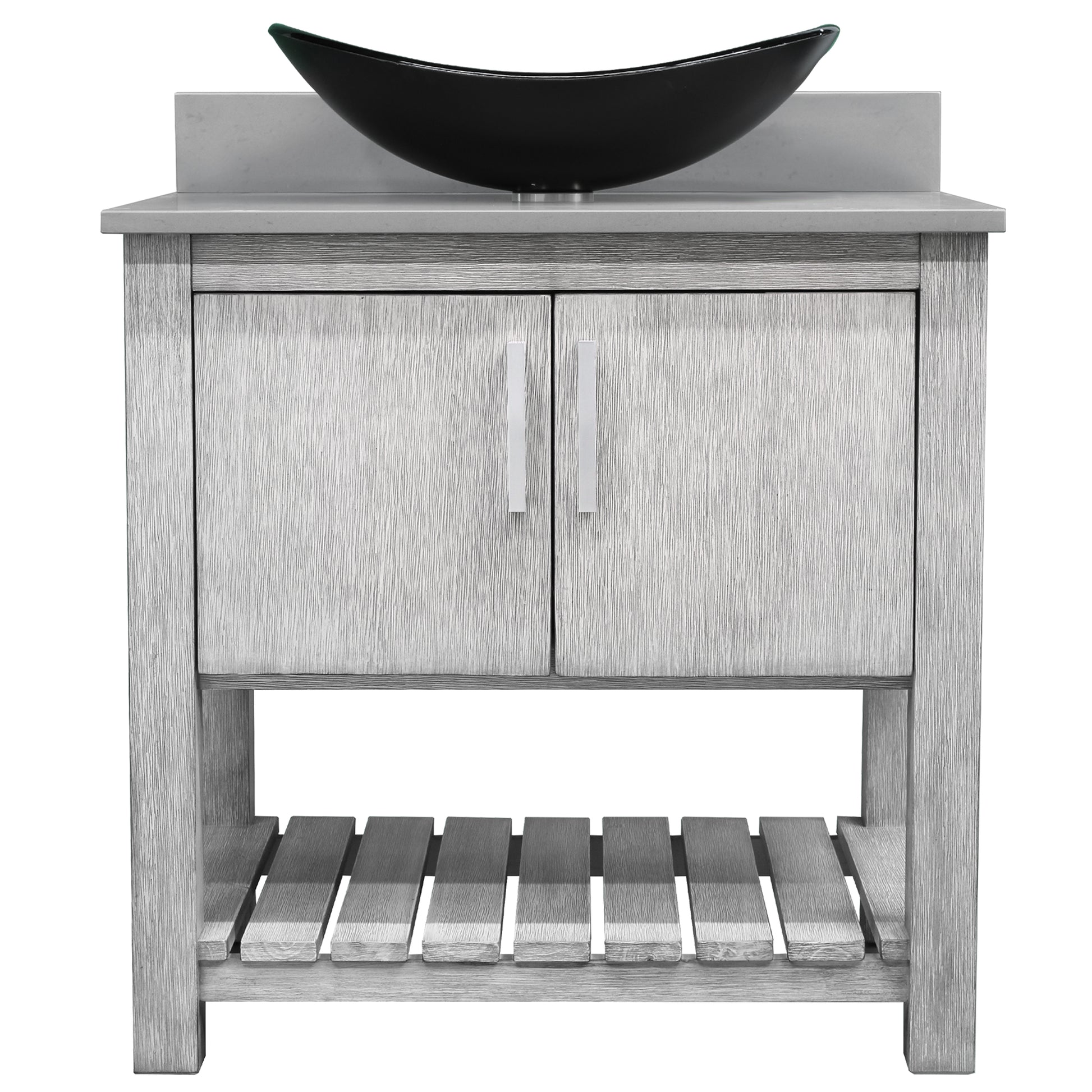 - Set includes: assembled vanity, door handles, quartz top & backsplash, glass vessel sink, pop-up drain with matching mounting ring and p-trap