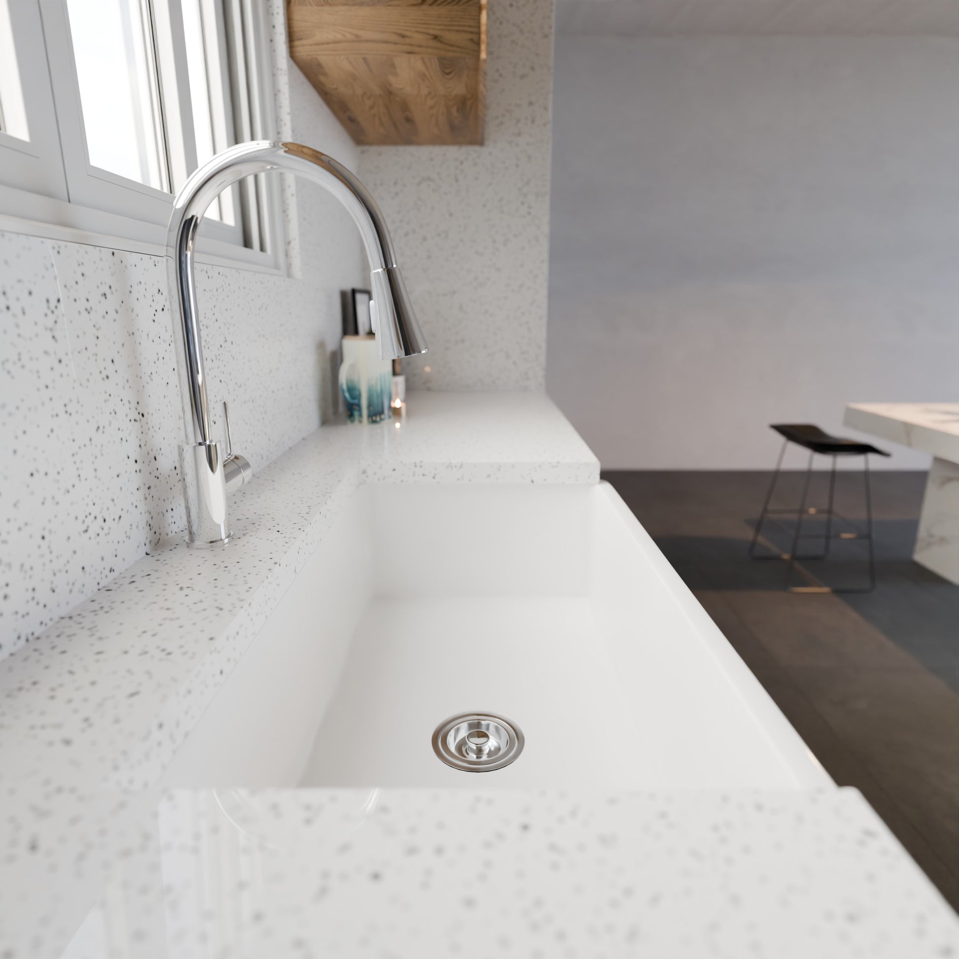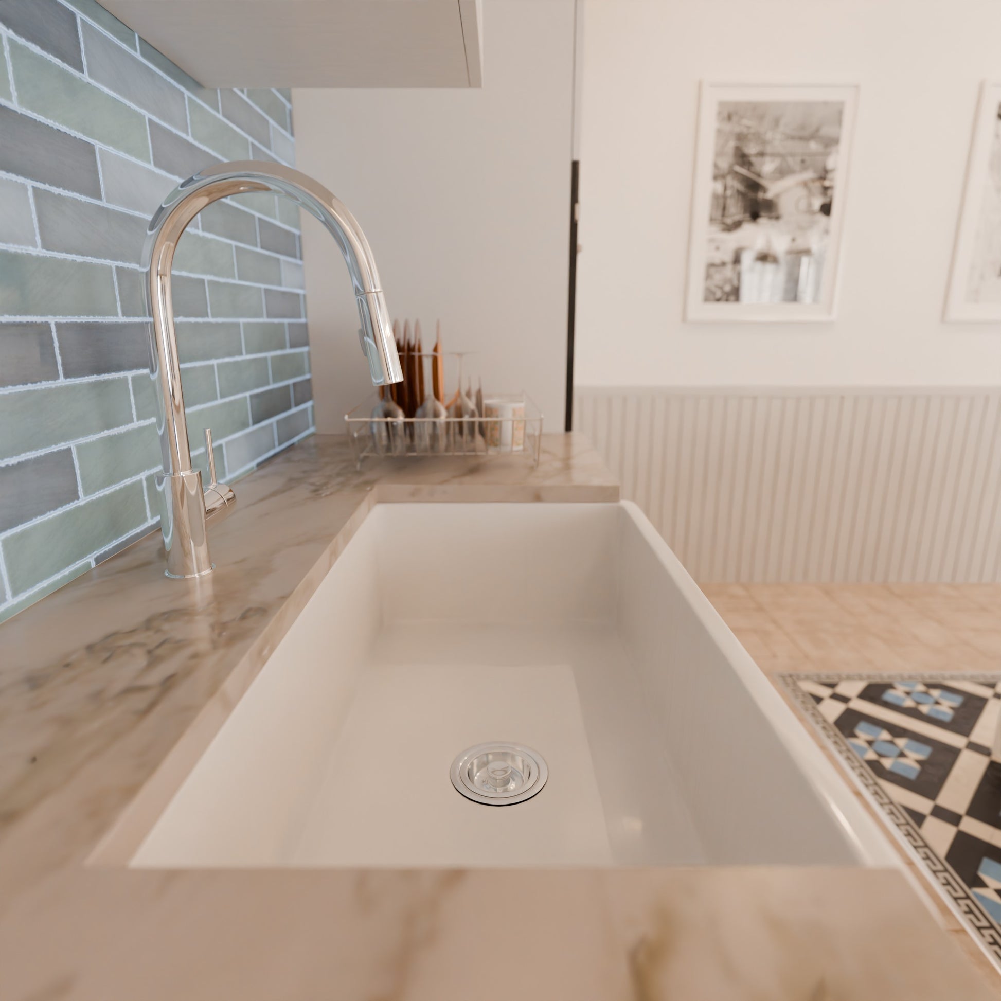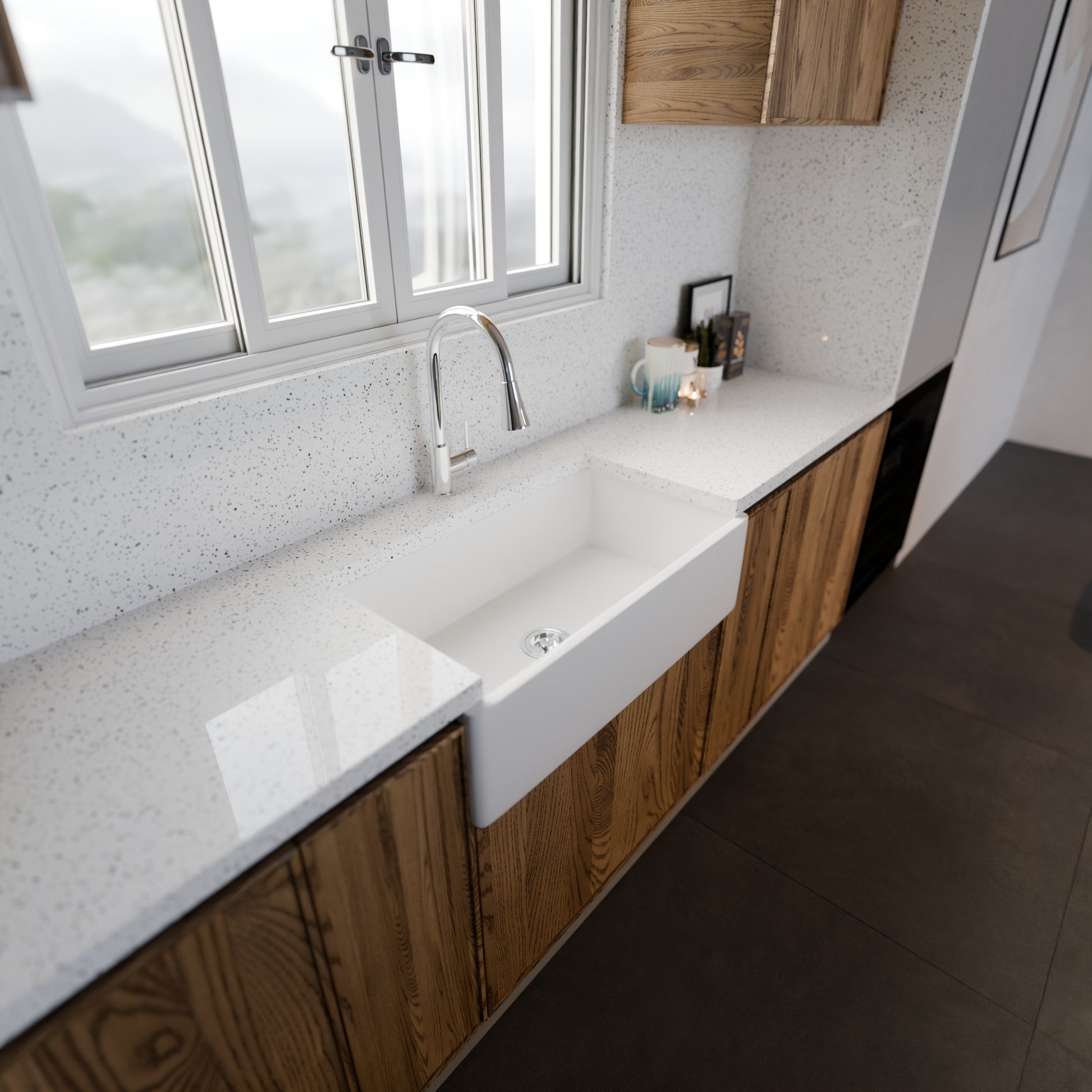 When quality, durability, and a simplistic design are needed for the kitchen, look no further. Designed to showcase a bold apron out front, this kitchen sink will complement the kitchen's decorative style beautifully. Not only a stunning focal point this farmhouse sink is constructed from premium porcelain making it heat, scratch, and stain resistant for the ultimate kitchen durability.