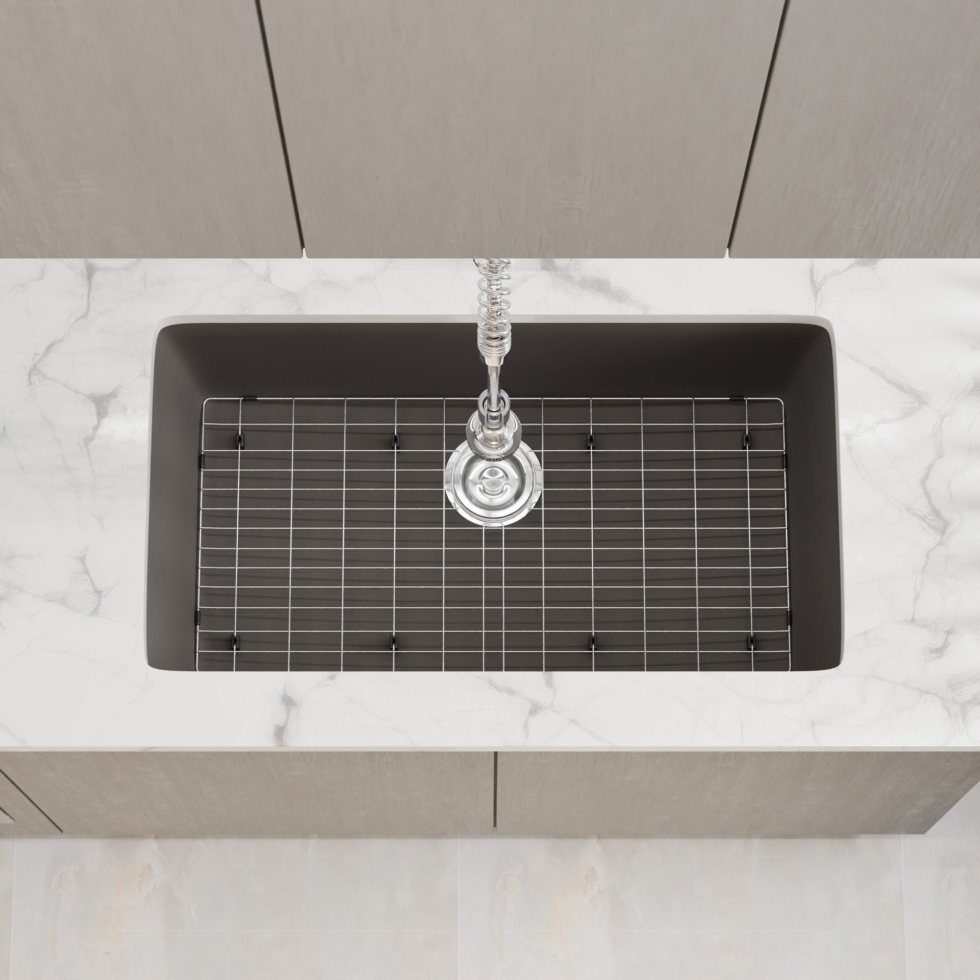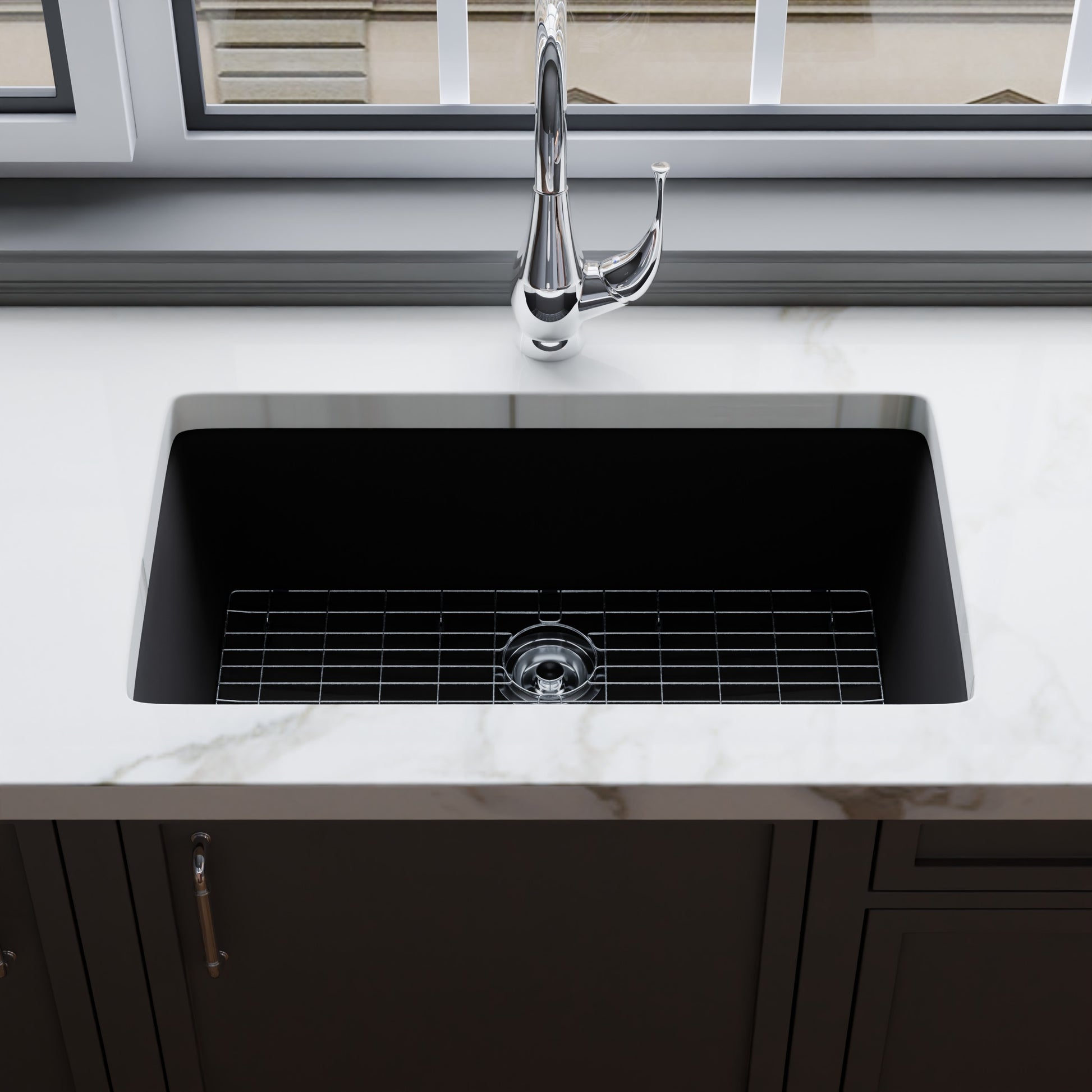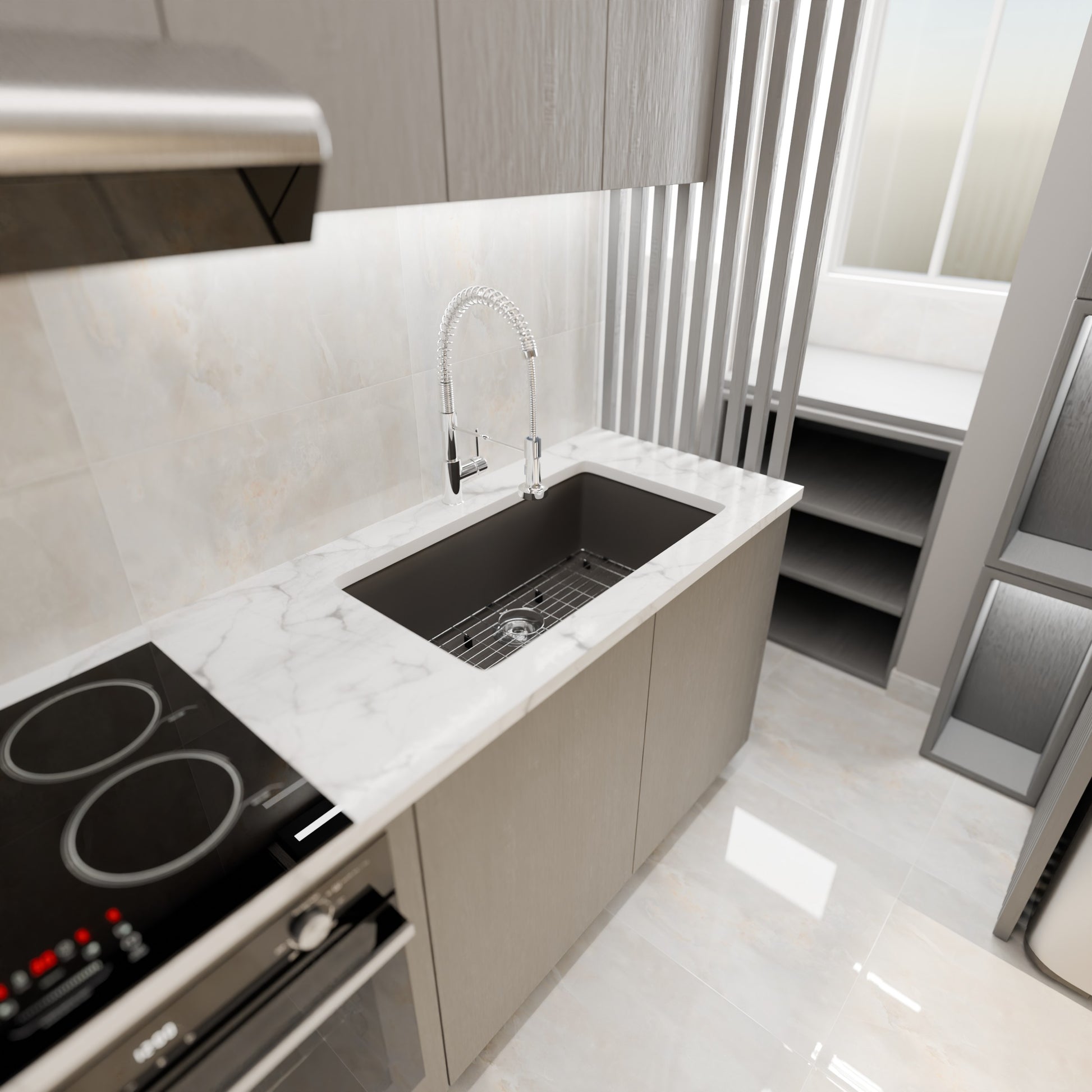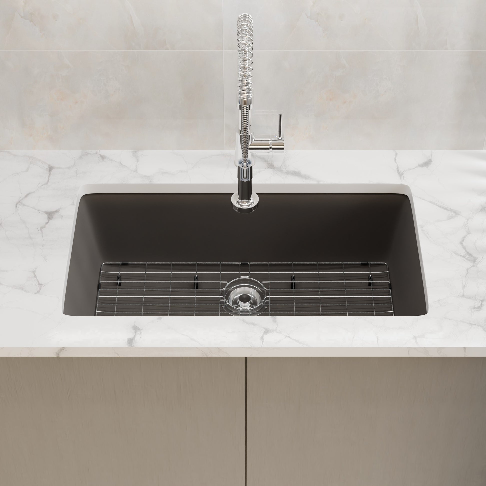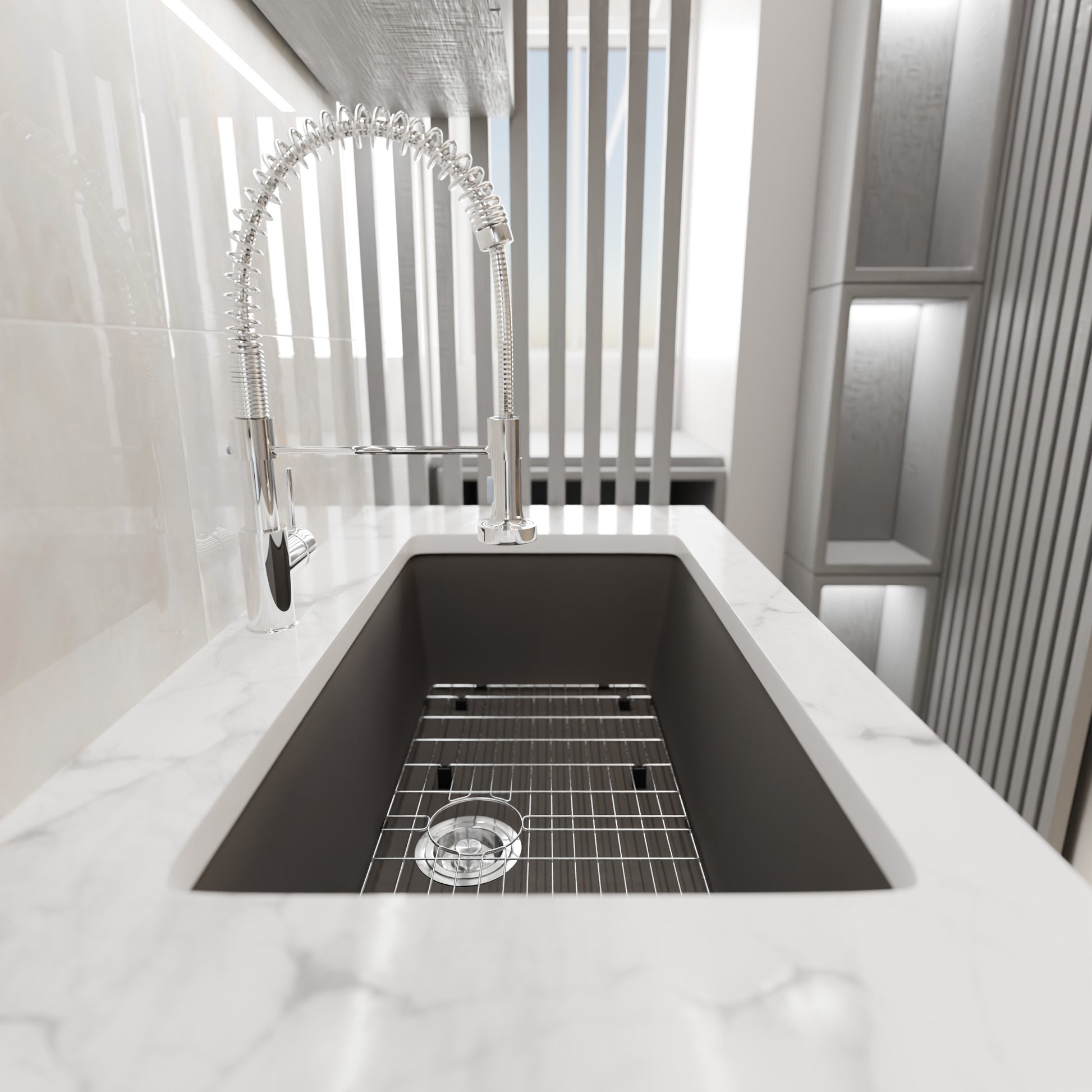 Designed for standard under-mount installation, this sink is heat resistant and gracefully withstands rapid temperature changes from hot to cold water. Its material is highly resistant to stains, scratches, abrasions, and impacts. The quartz composition absorbs vibrations, allowing for minimizing noise during use.