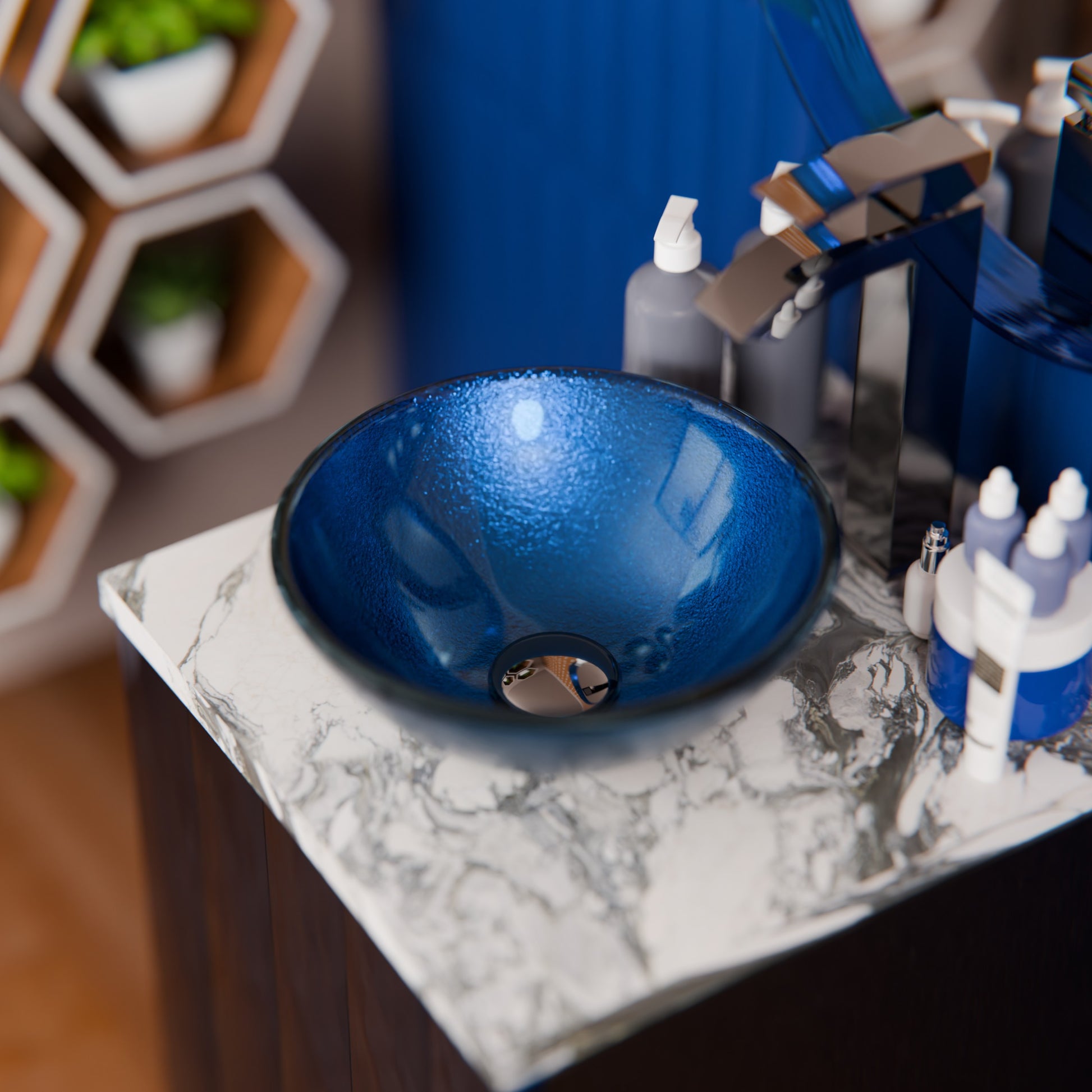 This blue glass vessel is one of Novatto's finest. Constructed of high-tempered glass in a classic round shape, the Verdazzurro Mini vessel has a foil-painted bottom. Novatto uses advanced technology to produce beautiful glass vessel sinks with unmatched structural integrity and longevity. Constructed of thick 1/2 inch clear high-tempered glass, this blue vessel sink will add a punch of cool blue color to your decor. Internal testing has found these vessel sinks to be very durable and forgiving. Tempered glass cannot be compared to everyday synthetic porcelain and ceramics. Made with the highest quality and creative design standards, Novatto sinks add art and function to any bath or powder room.