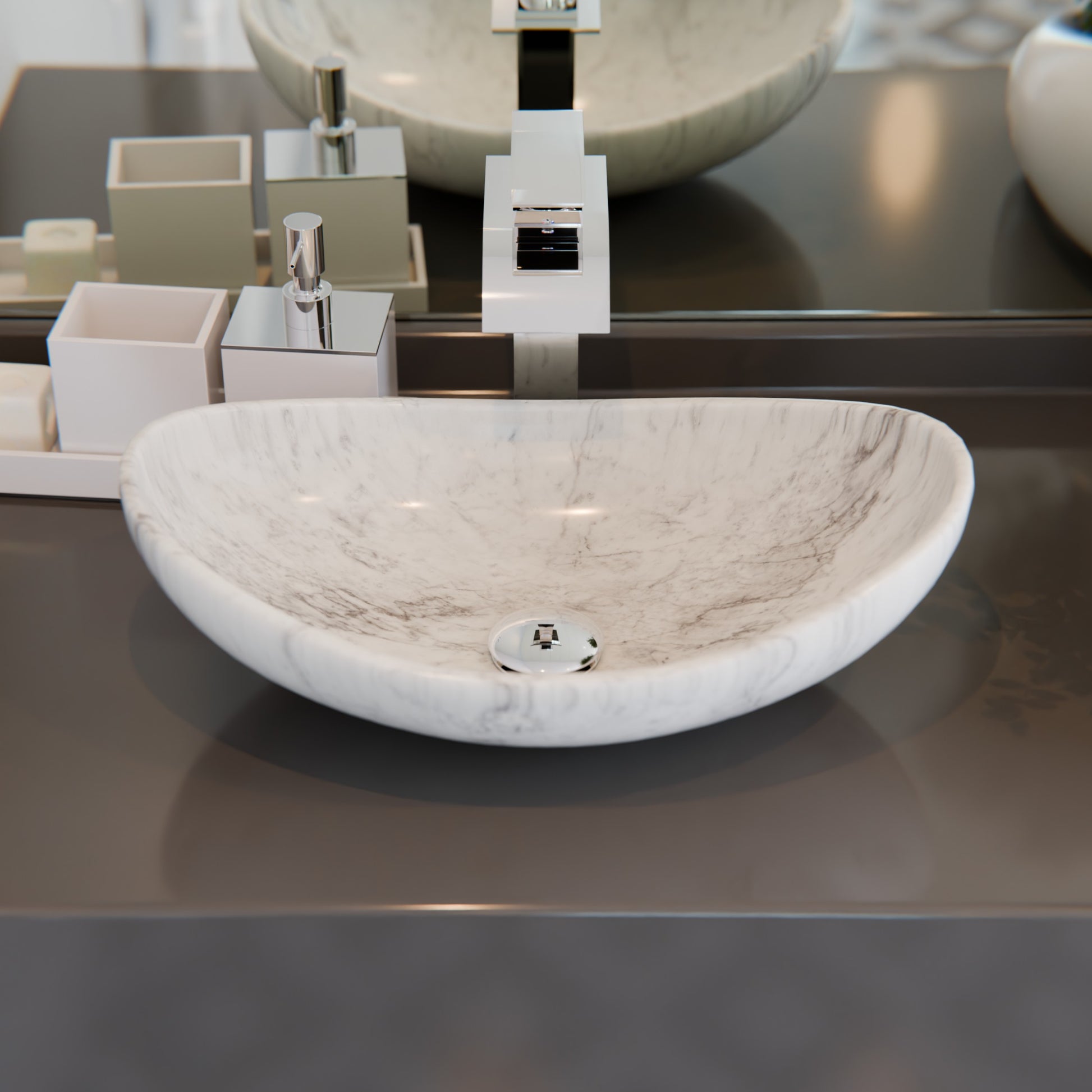 - Carrara marble oval slipper vessel sink, white tones with grey veining