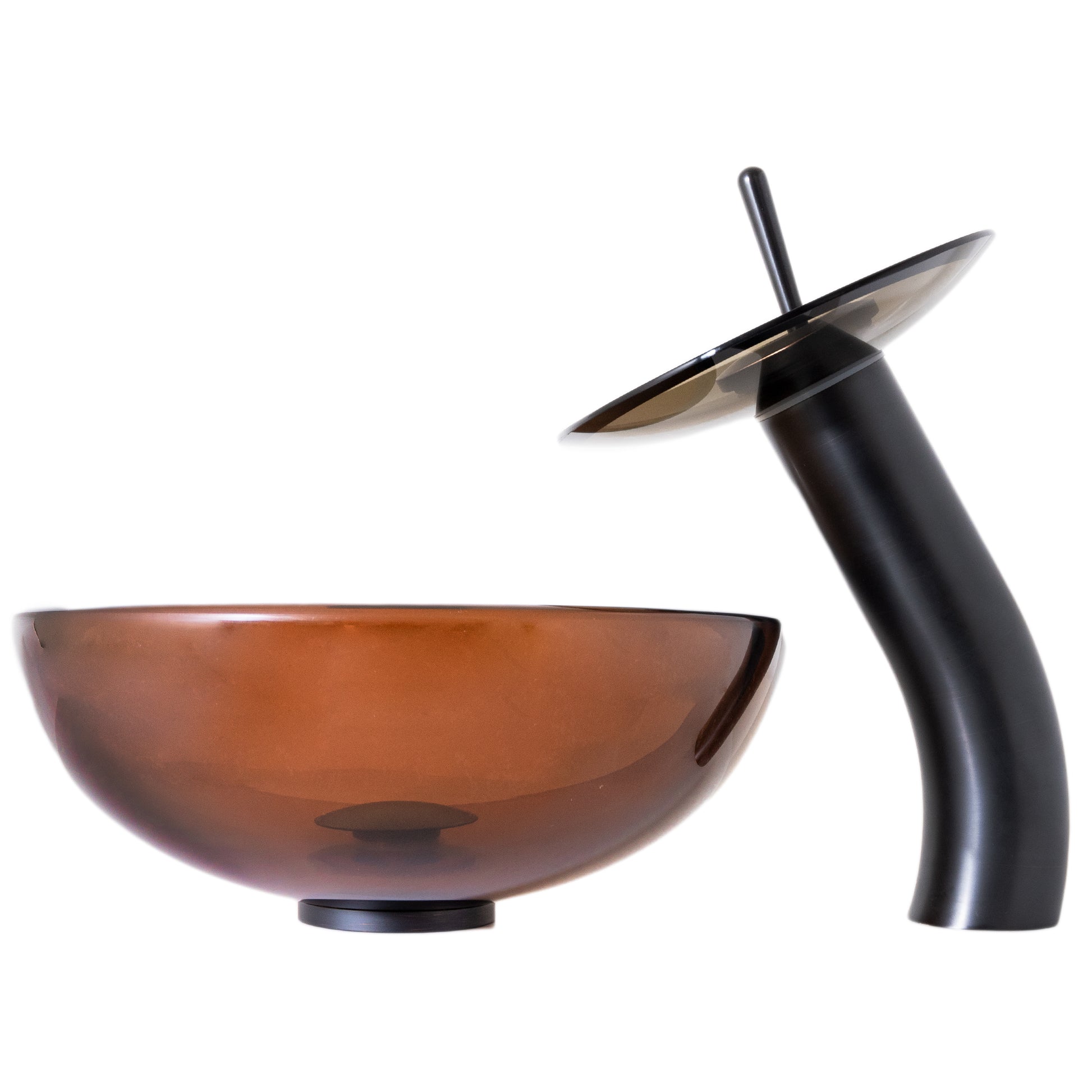 The oil-rubbed bronze waterfall faucet is constructed from solid brass with a high-pressure ceramic cartridge. The faucet is AB1953 Low Lead compliant. A single handle controls temperature and water flow. The sink has a 1.75-inch drain opening for standard plumbing connections. This sink and faucet set is designed for an above-counter, single-hole installation.