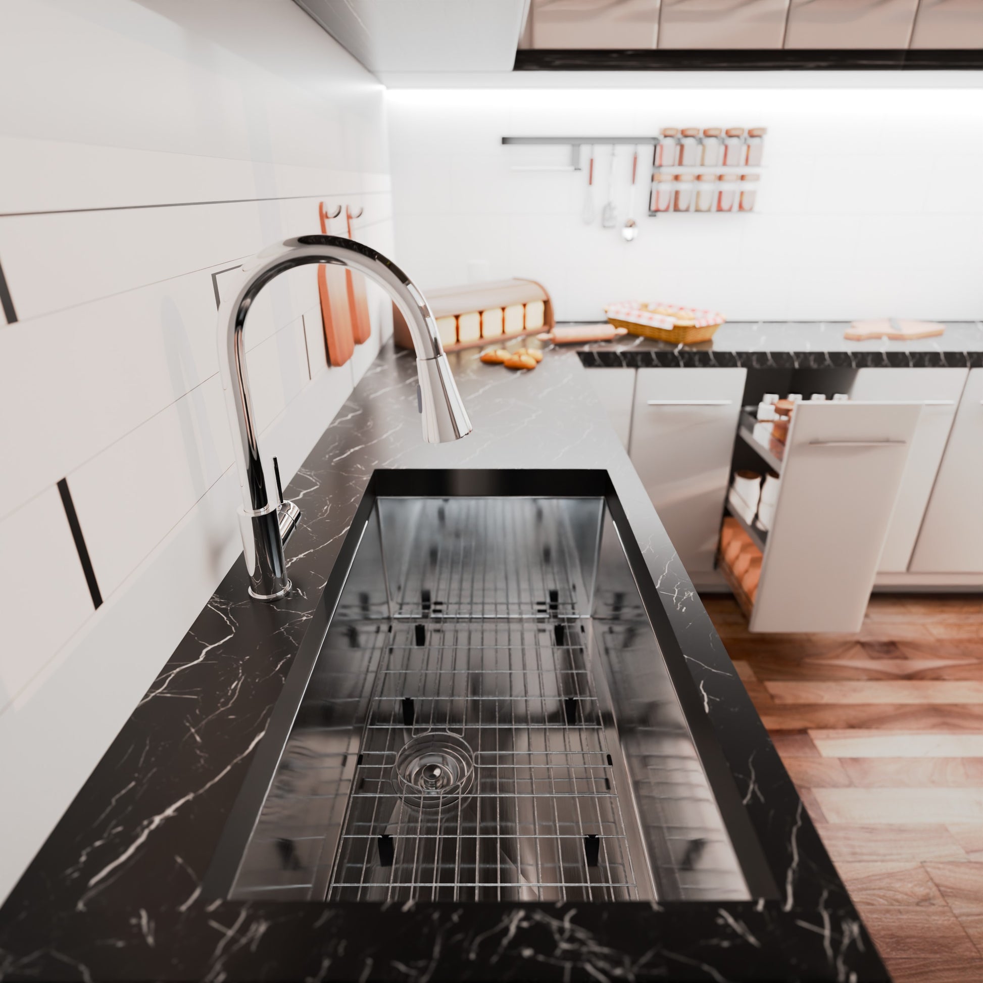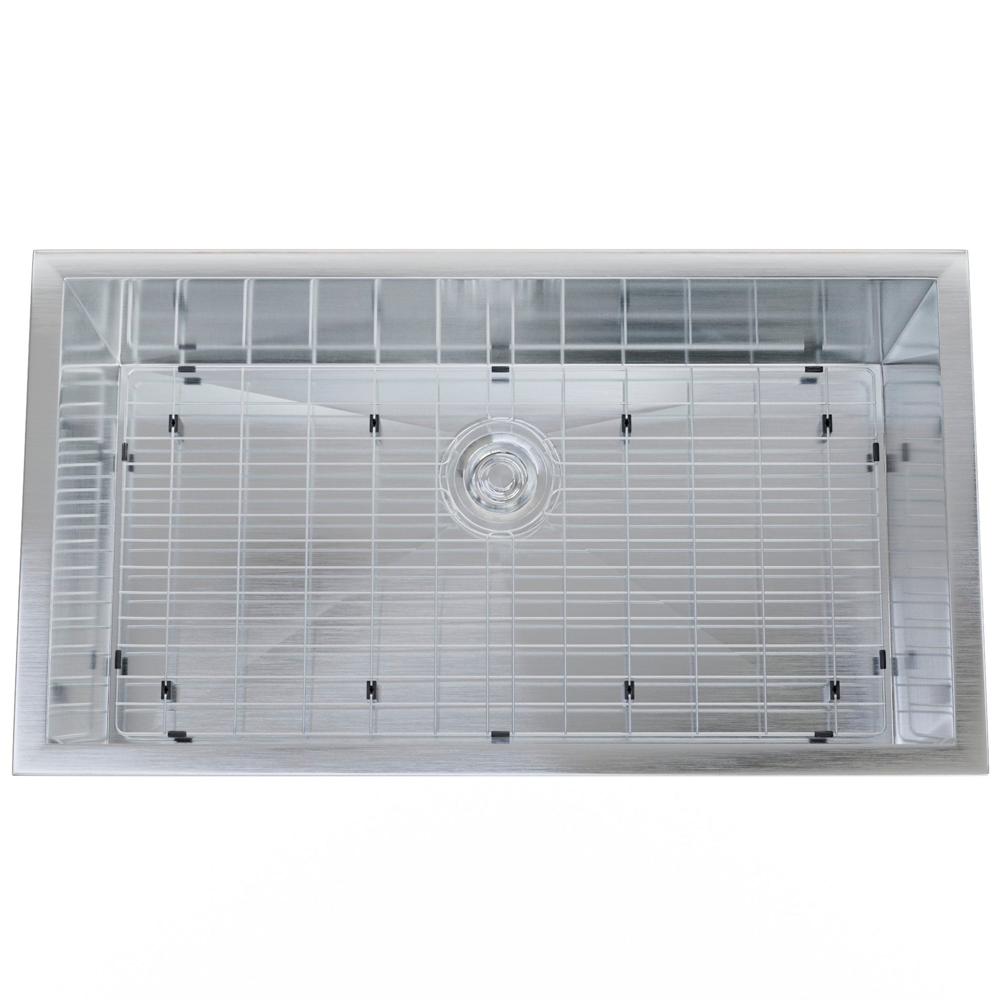 Complete your installation with our optional accessory kit which includes a stainless-steel bottom rinse grid that protects your sink against scratches and doubles as a drying rack as well as our easy-to-empty stainless-steel strainer drain in brushed nickel.