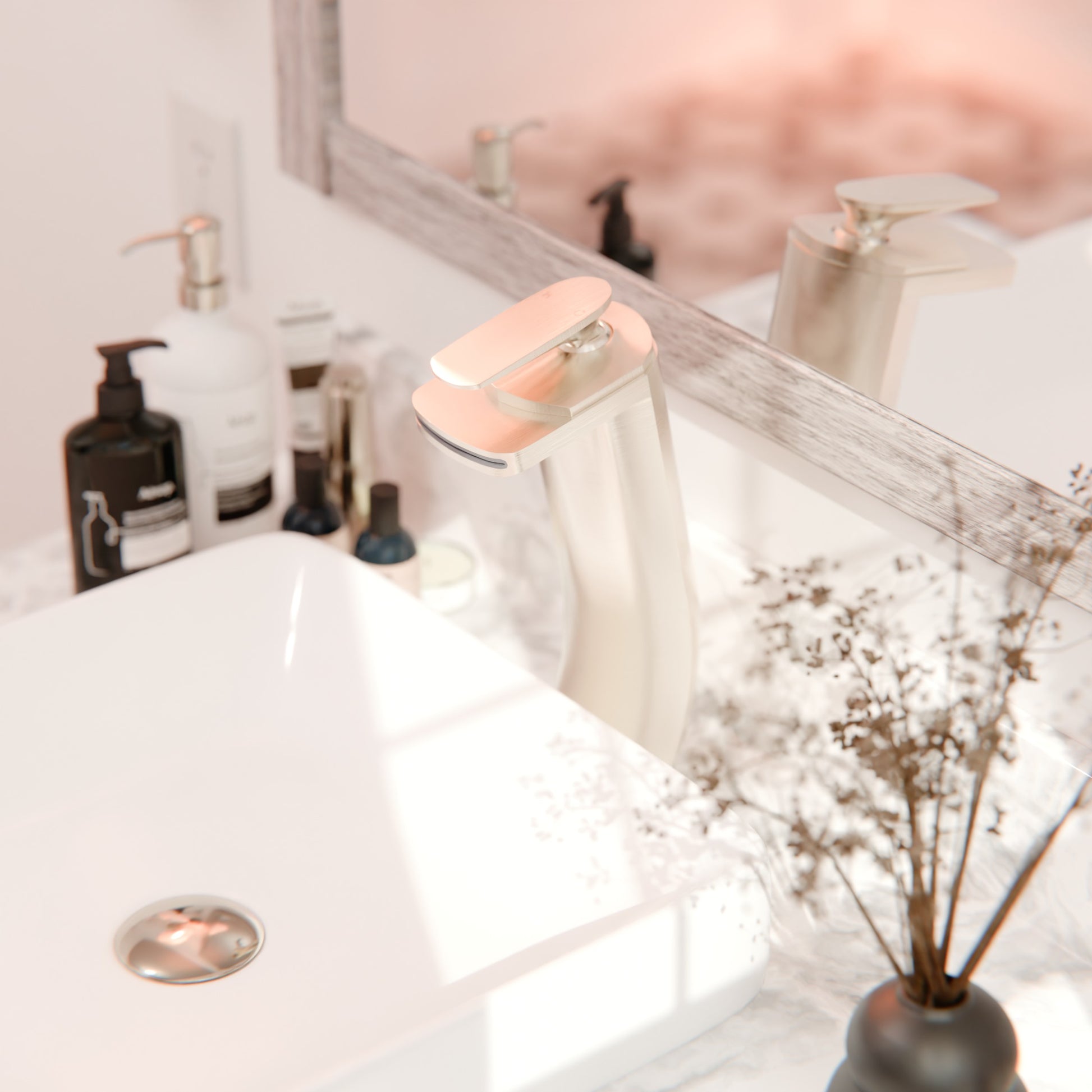 On the cutting edge of modern faucet design, this waterfall faucet will add a touch of style and sophistication to any bath or powder room. The water runs through the flat spout, creating a three-inch wide miniature waterfall. Specifically designed to accommodate a vessel sink, the Cascade single-hole faucet is designed to be mounted directly on the counter. Our taller faucet design provides more room under the spout for washing and cleaning those hands.