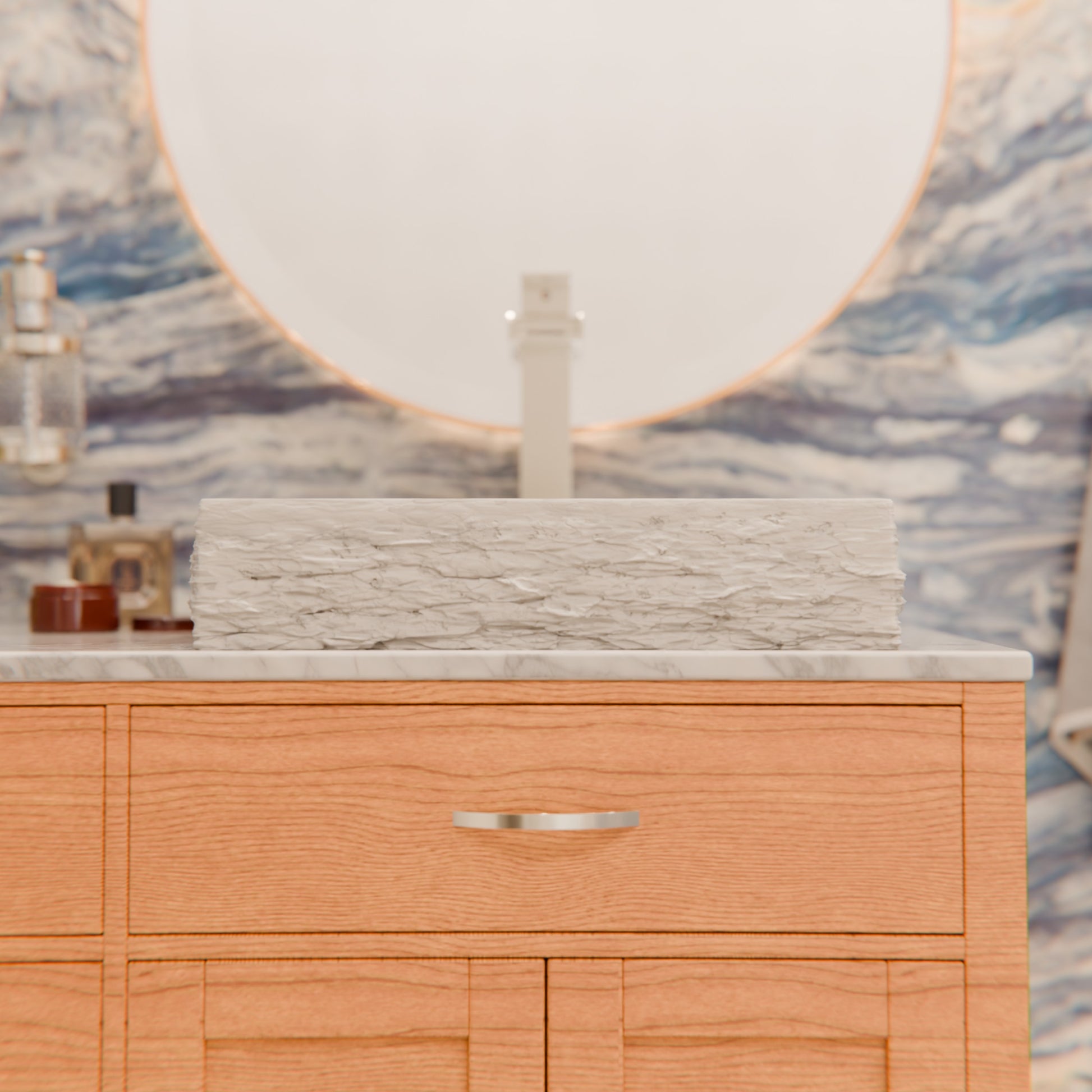 - Carrara marble square vessel sink, white tones with grey natural veining