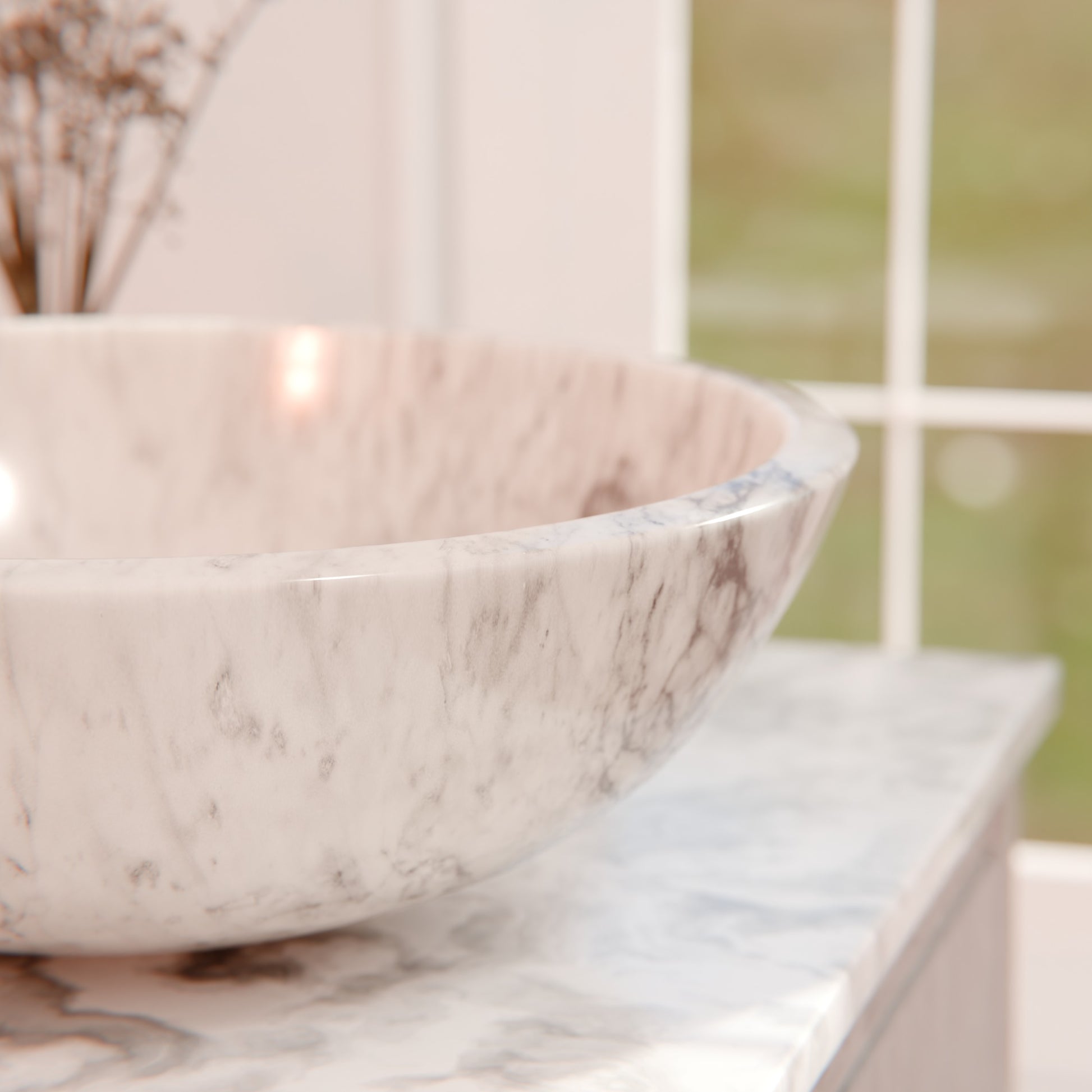 Made with nature as both guide and inspiration, Novatto's marble vessels will add character and charm to your bath. Our Carrara white marble sinks come from around the world, giving you a one-of-a-kind bath masterpiece. Natural stone cannot be compared to everyday synthetic porcelain and ceramics. Honed and hand-polished to perfection, each 17-inch round vessel sink is beautifully unique in tones of white and grey. Because marble is from Mother Nature, each sink will vary slightly in color and veining.