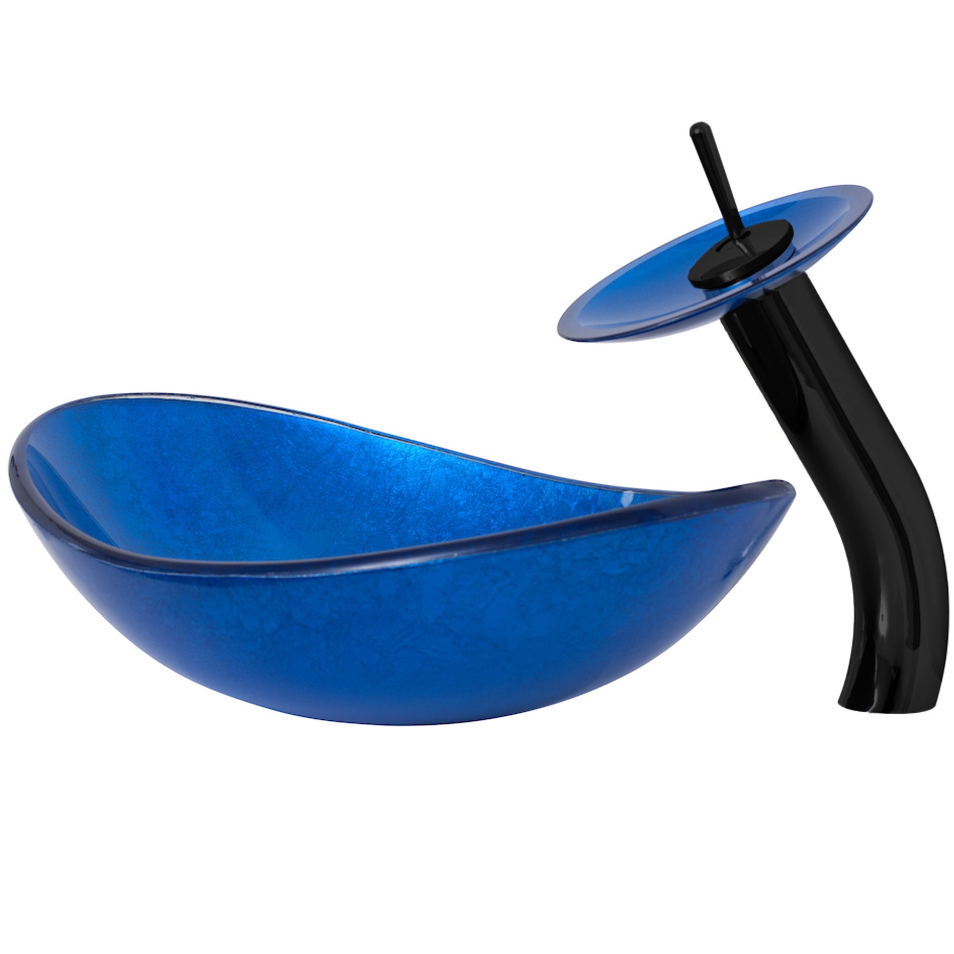 Constructed of thick 1/2 inch high tempered glass in a unique slipper shape, this vessel has a blue hand foil-painted bottom and will add a punch of cool blue color to your decor. The matching faucet disc directs the water flow into a graceful waterfall.