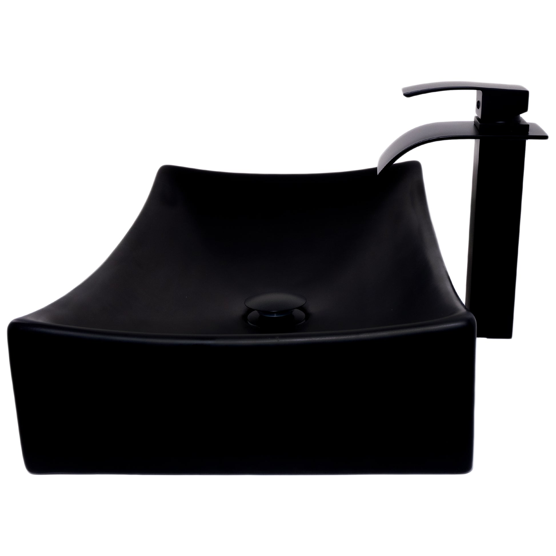 - Rectangular matte black porcelain sink with no overflow