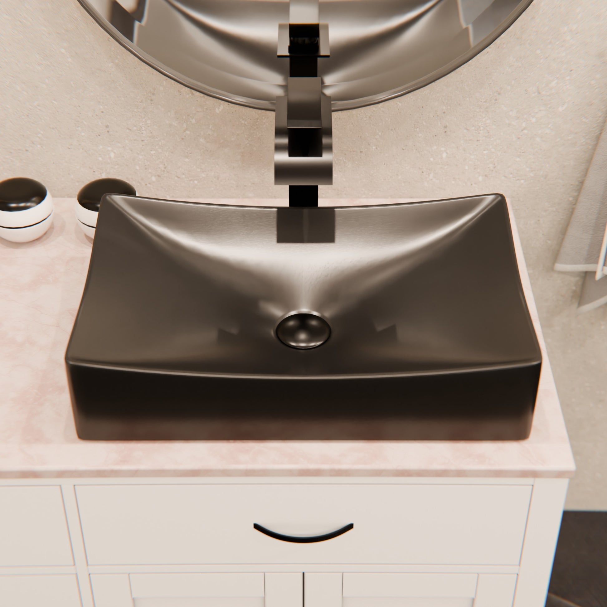 - Rectangle, matte black porcelain vessel sink with no overflow