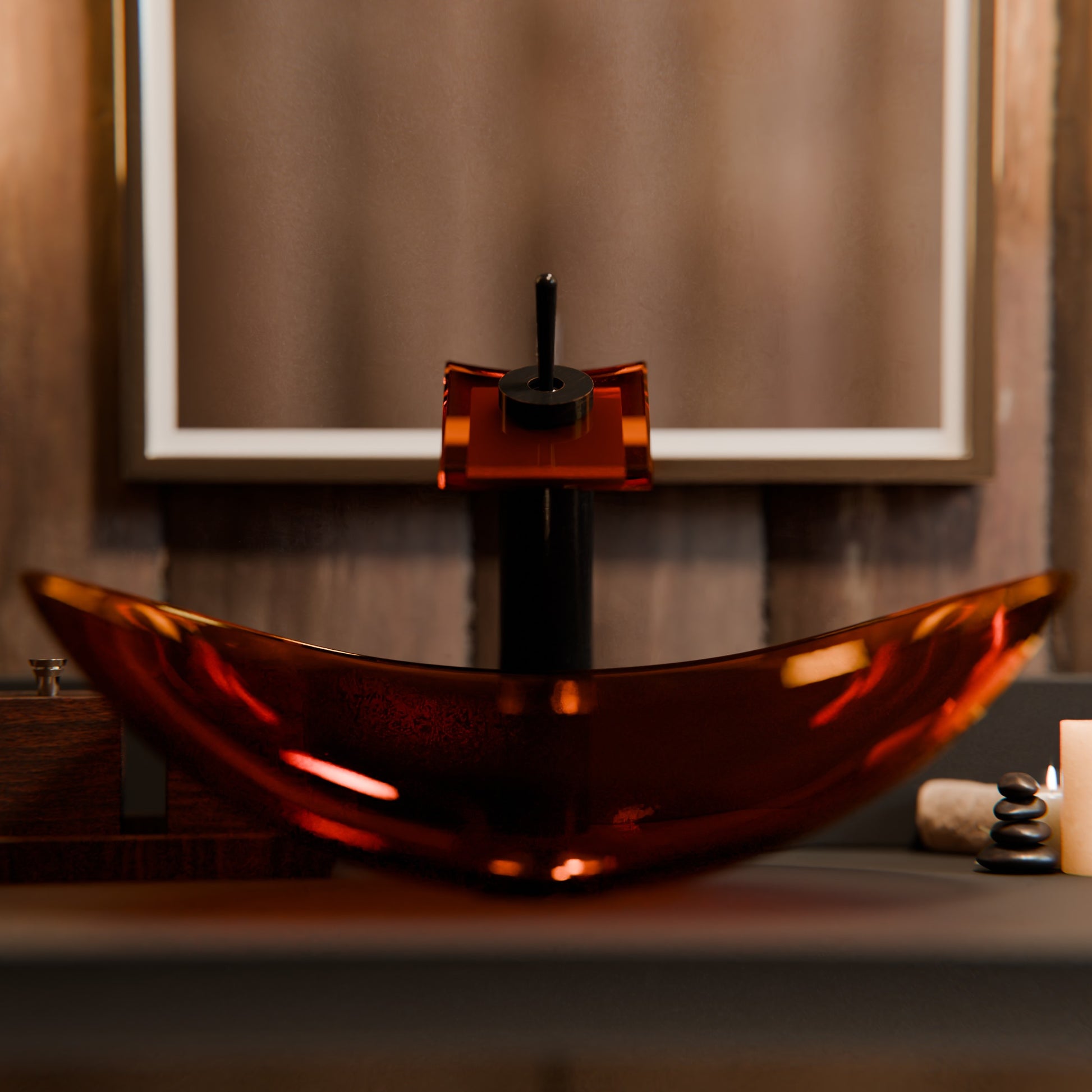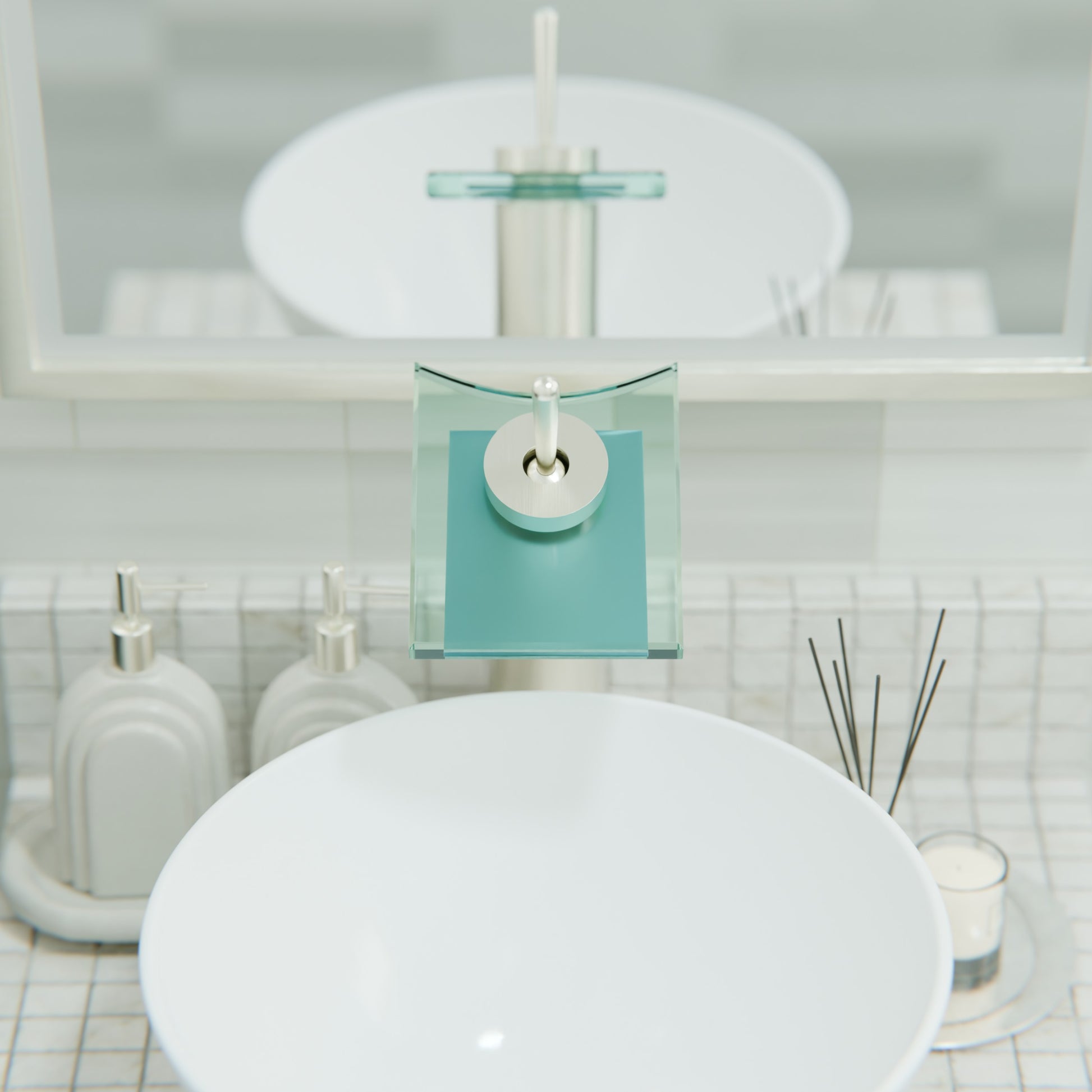 Add a splash of excitement and transform your bathroom into an enchanting oasis with its own soothing waterfall. This eye-catching faucet from Novatto is designed to accommodate vessel sinks. The water runs through the frosted glass creating a three-inch wide miniature waterfall. A single lever controls the temperature and water pressure. Durable and easy to clean, the Squared faucet is constructed of solid brass and lifelong finishes, available in chrome, brushed nickel, or oil-rubbed bronze. Also available are matching pop-up drains.