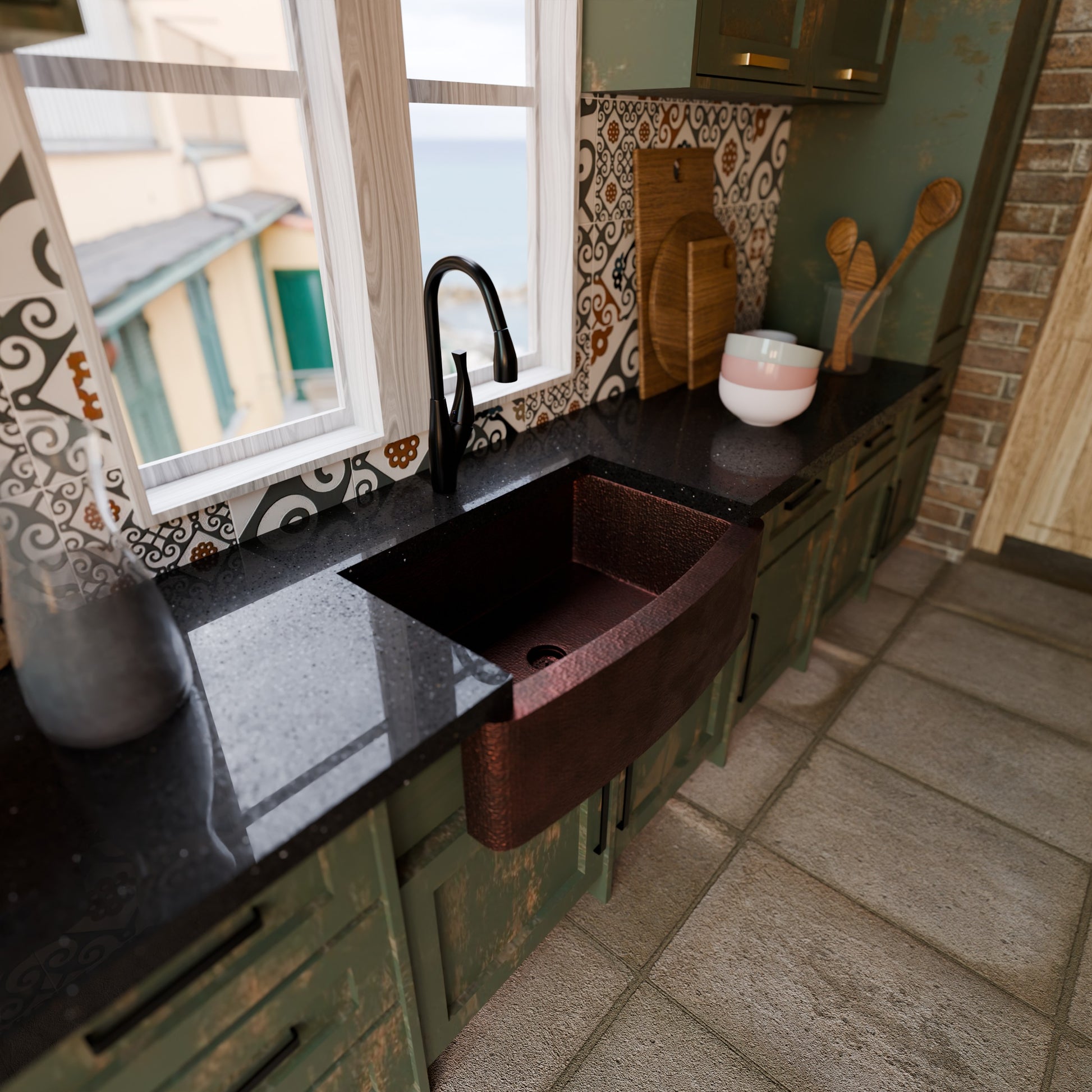 - Single large kitchen sink with curved apron