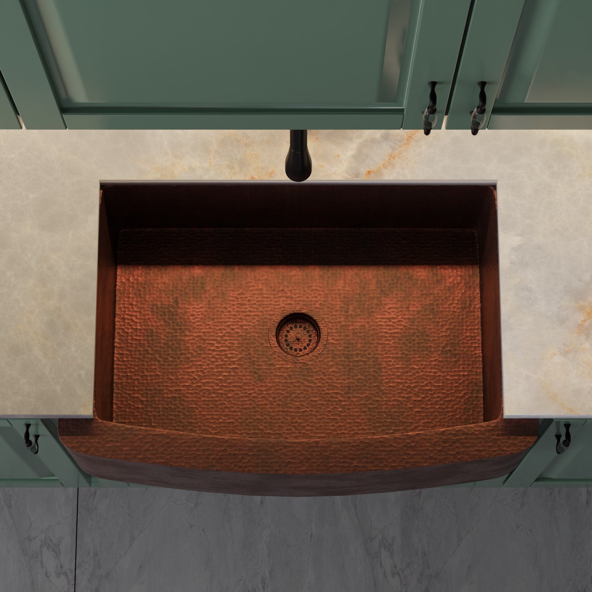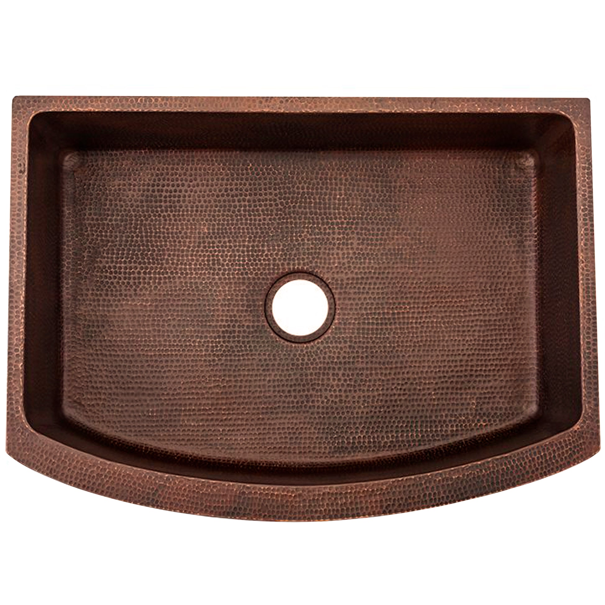 The Redondeado open farmhouse sink is hand-hammered from 100% recycled copper by our master artisans. Through years of skill and experience passed down from previous generations, the end result is a one-of-a-kind work of art. Made from *16 gauge copper*, this luxurious single large sink with a curved front apron has a warm antique finish. It allows for either an apron front or undermount installation. A spacious 29 x 18 interior makes washing any dishes a breeze. It has a 3.5-inch drain for standard U.S. plumbing connections.