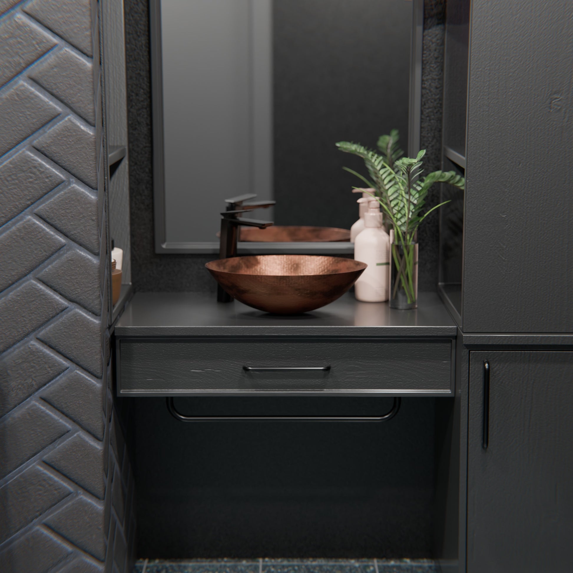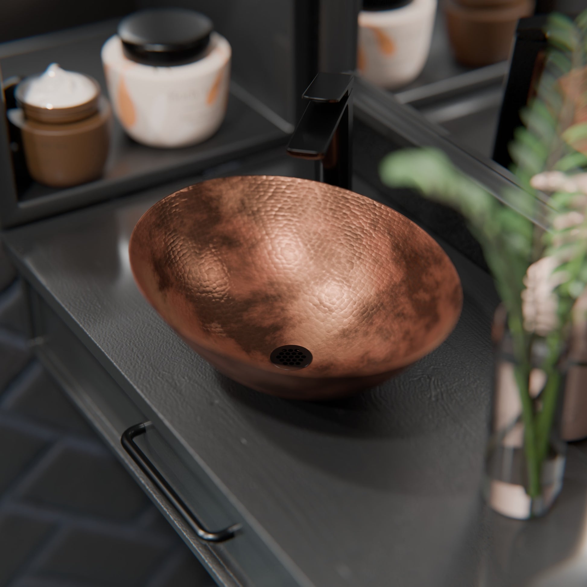 Copper has a living finish, and its patina will continue to develop character over time, meaning it will usually become a richer, darker color. The patina creates a unique look of complementing dark tones. Made with the highest standards of quality and creative design, Novatto sinks add art and function to any bath or powder room.