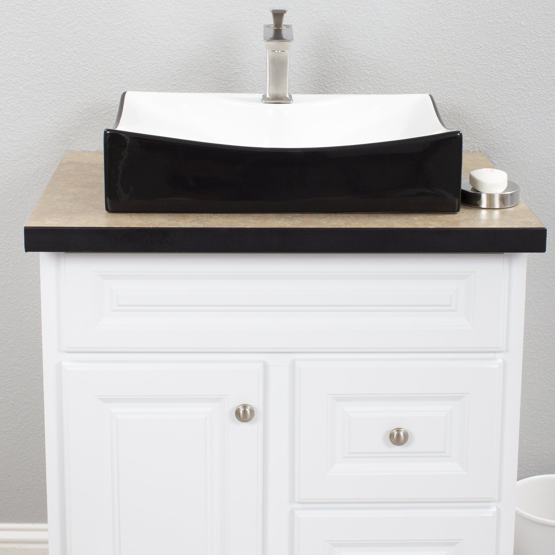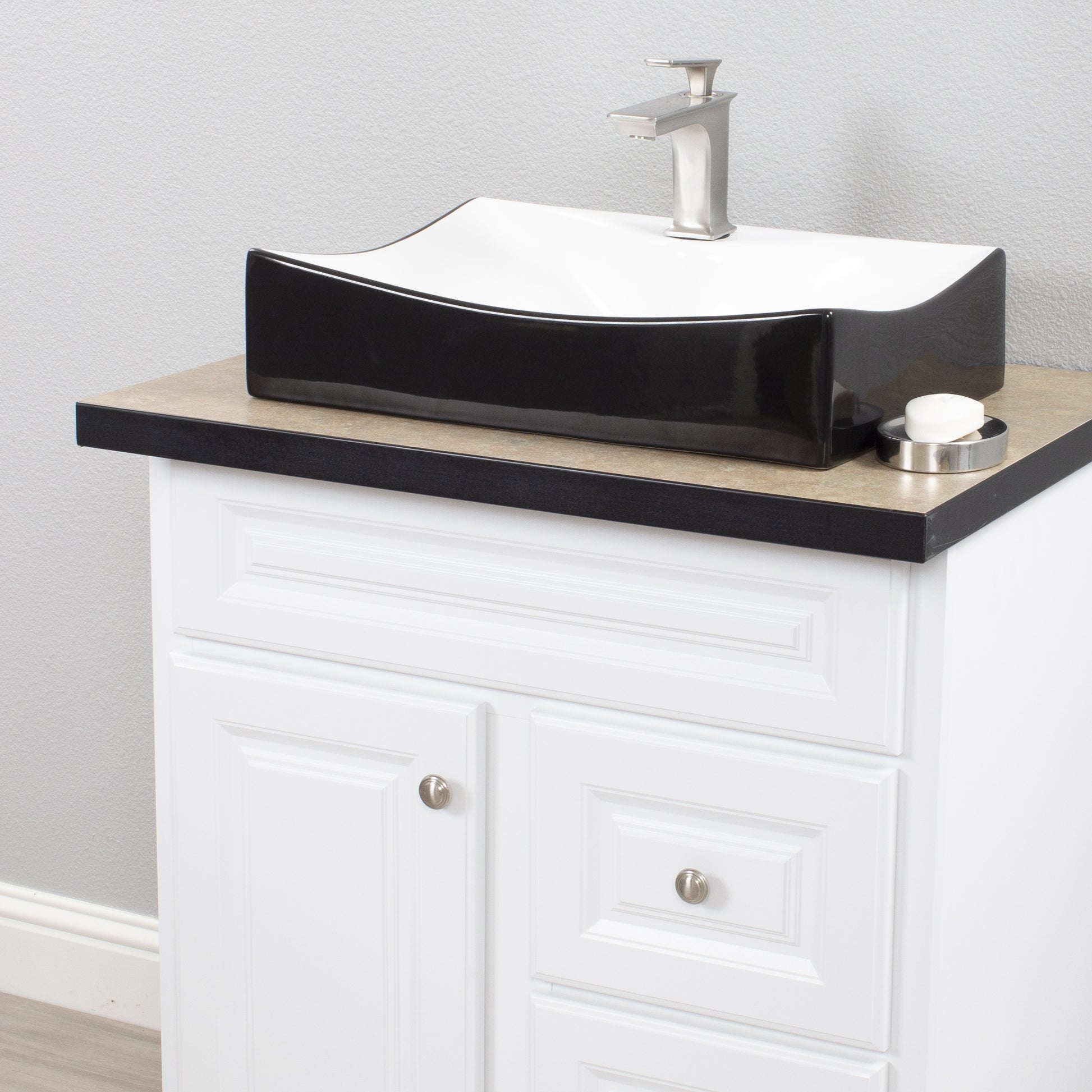 A timeless addition, this porcelain sink, and faucet combo includes everything needed for a contemporary upgrade. The outside edge is bordered in rich black color while the inside is a bright white. As an industry leader in bathroom vessel sinks, Novatto uses advanced technology to produce beautiful vessel sinks with unmatched structural integrity and longevity. Each porcelain sink is protected with a premium gloss for less maintenance and lasting beauty. A non-porous and stain resistant finish ensures a new look for years to come.